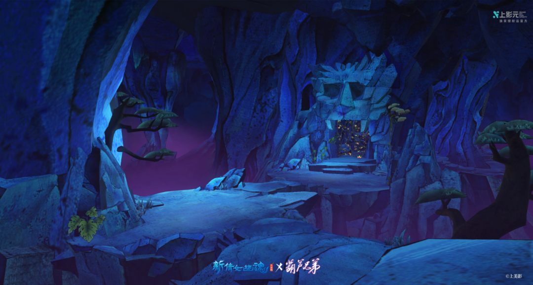 而蛇精洞府则尽显诡谲,洞口是一尊狰狞的石雕,张着血盆大口。洞内一股阴暗潮湿的气息扑面而来,洞府深处布满着无数岔路,墙壁上还结满蛛网。整个洞府被蓝紫冷调的光线笼罩,踏入洞内,总感觉蛇精就在暗处盯着你,已经鸡皮疙瘩起一地啦!