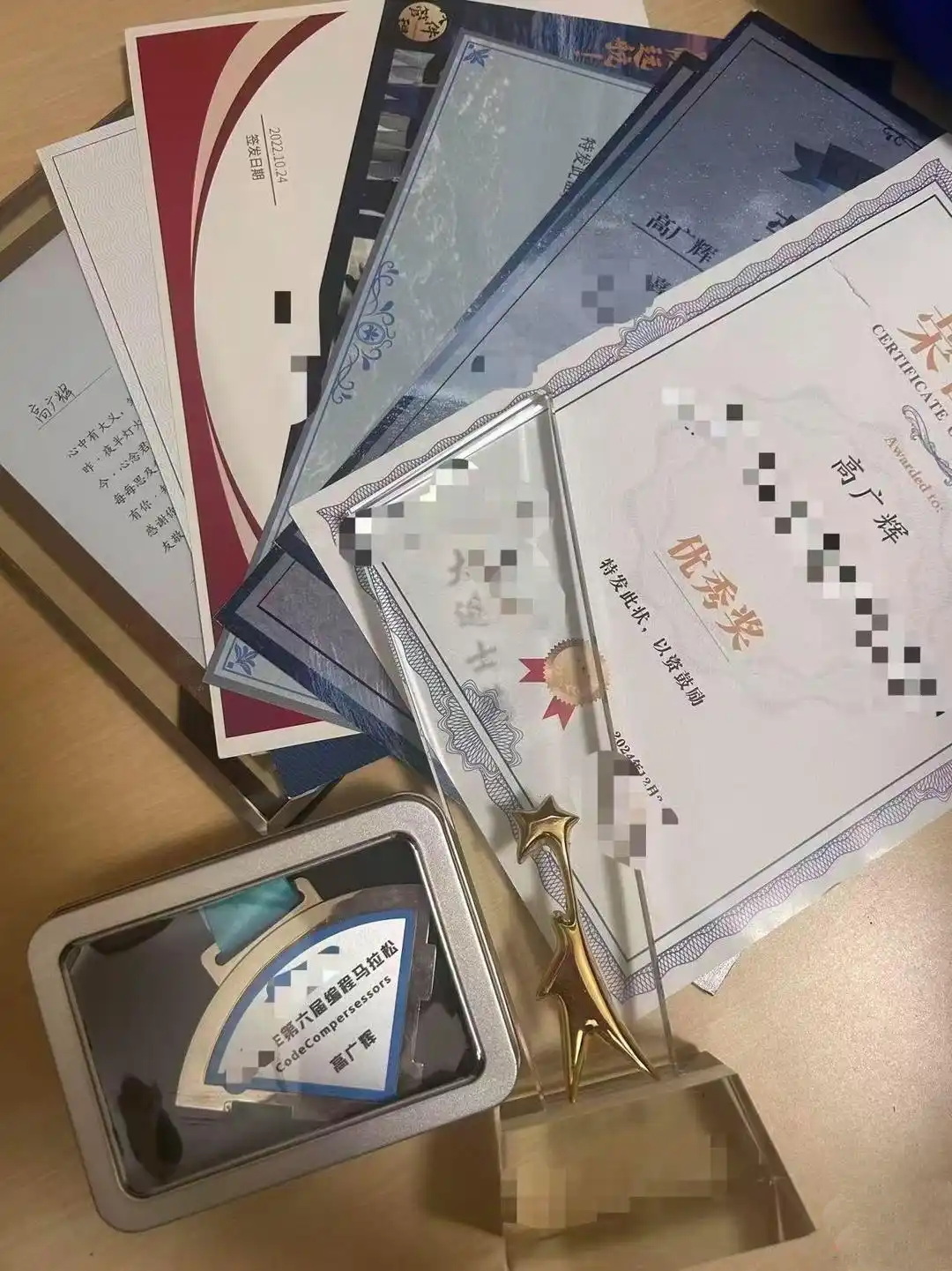 还有“编程马拉松”奖牌和九张奖状。这些荣誉见证了他的专业能力,也记录了他付出的代价。