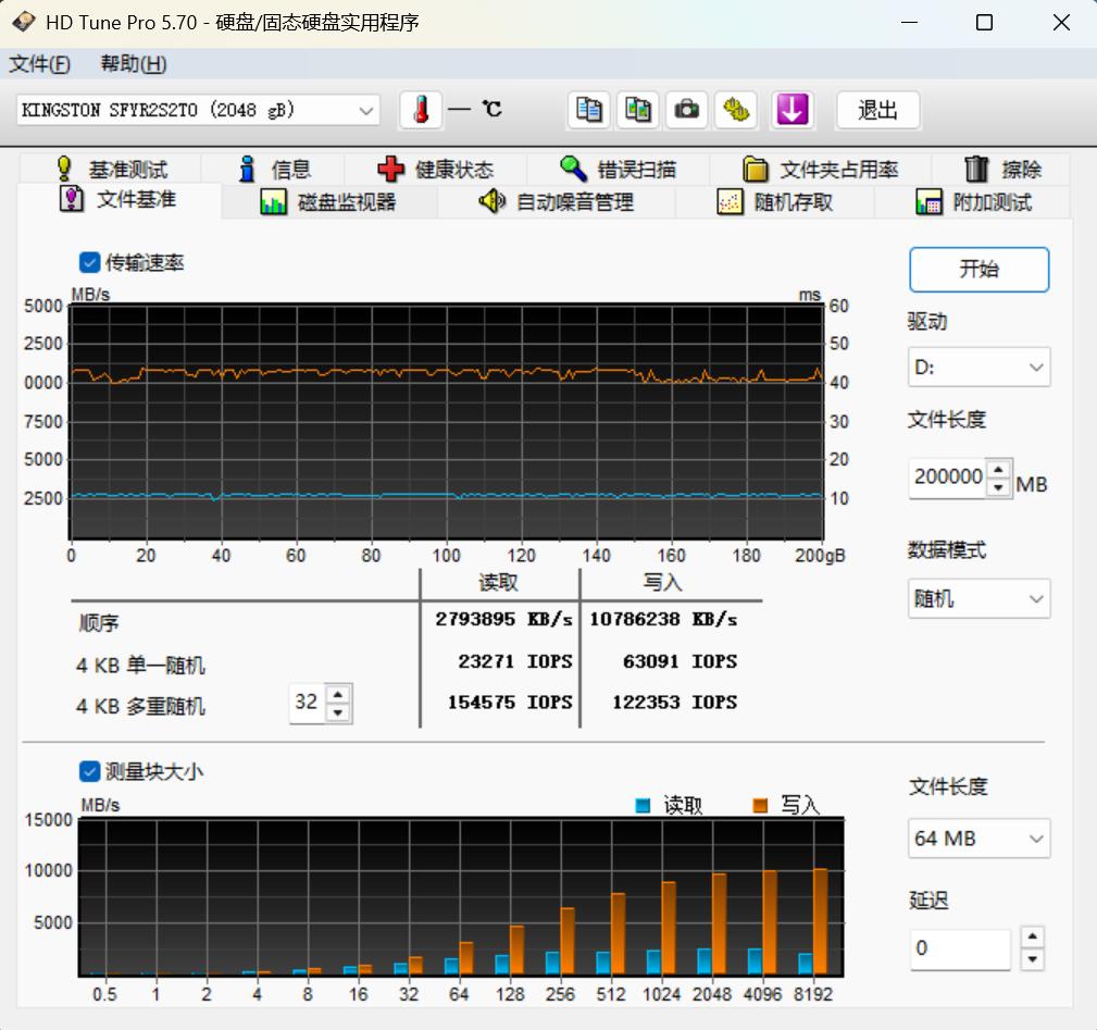 经过HD TUNE的文件基准测试,将写入样本设定为200G,测试结果如下。