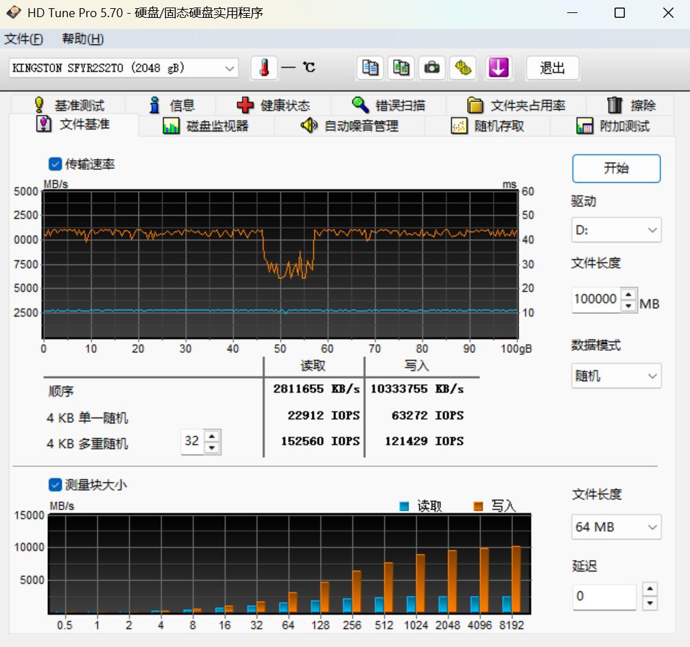 经过HD TUNE的文件基准测试,将写入样本设定为100G,测试结果如下。