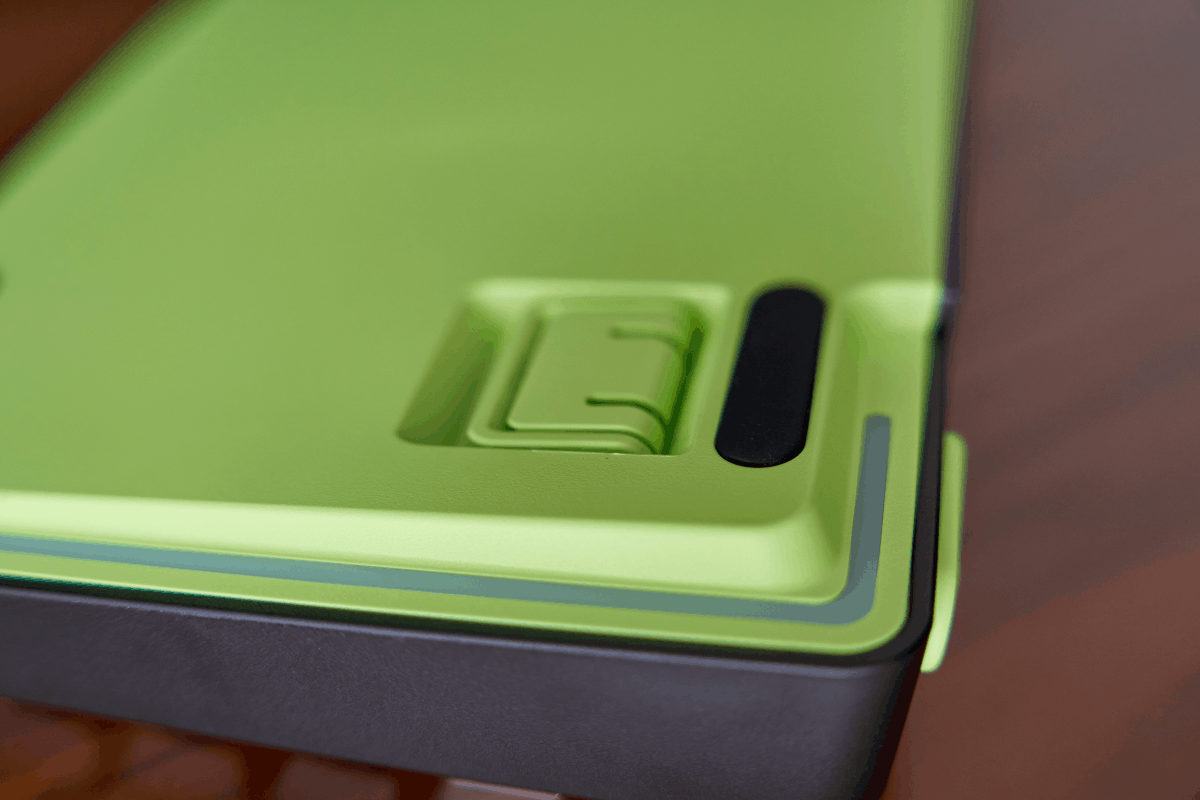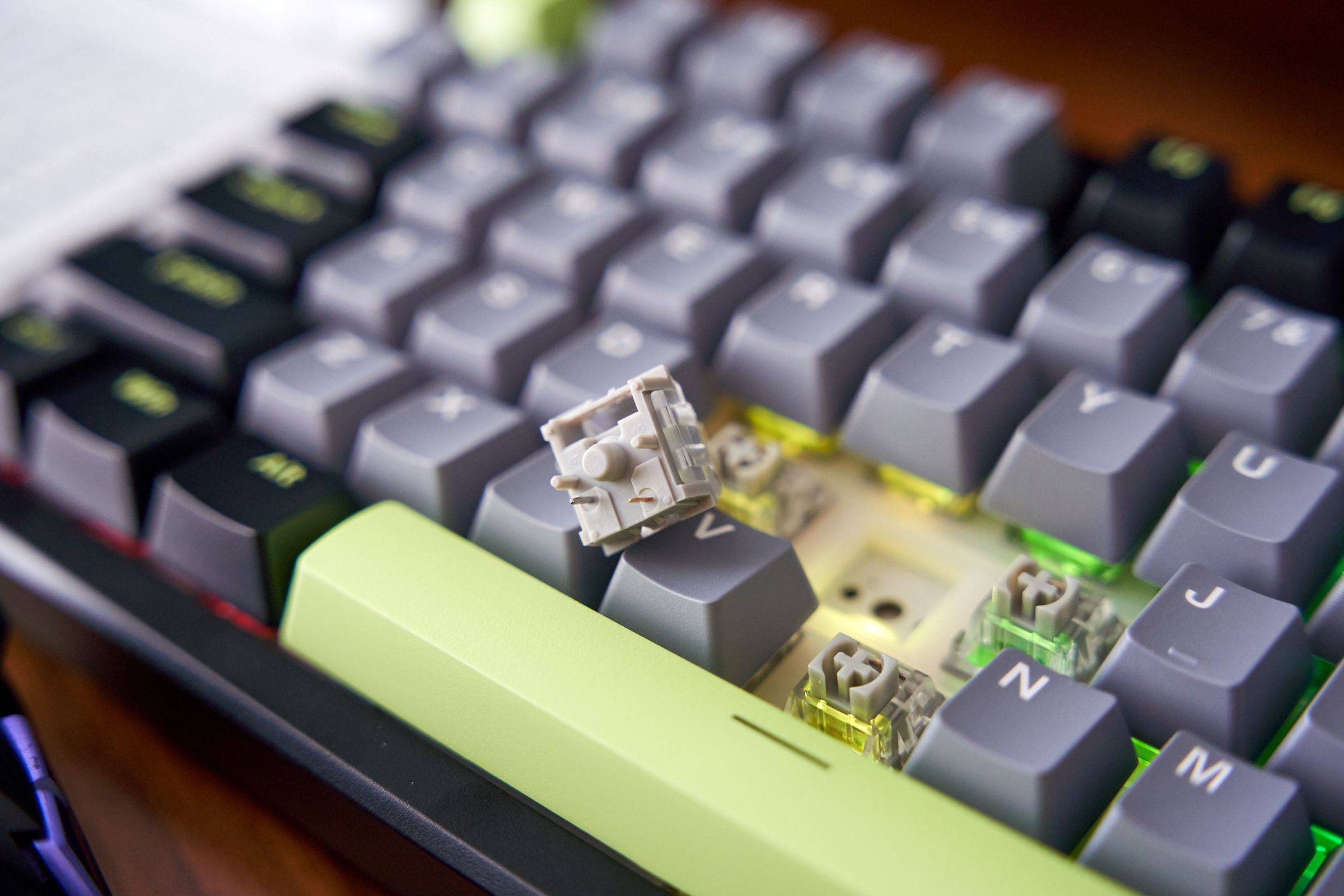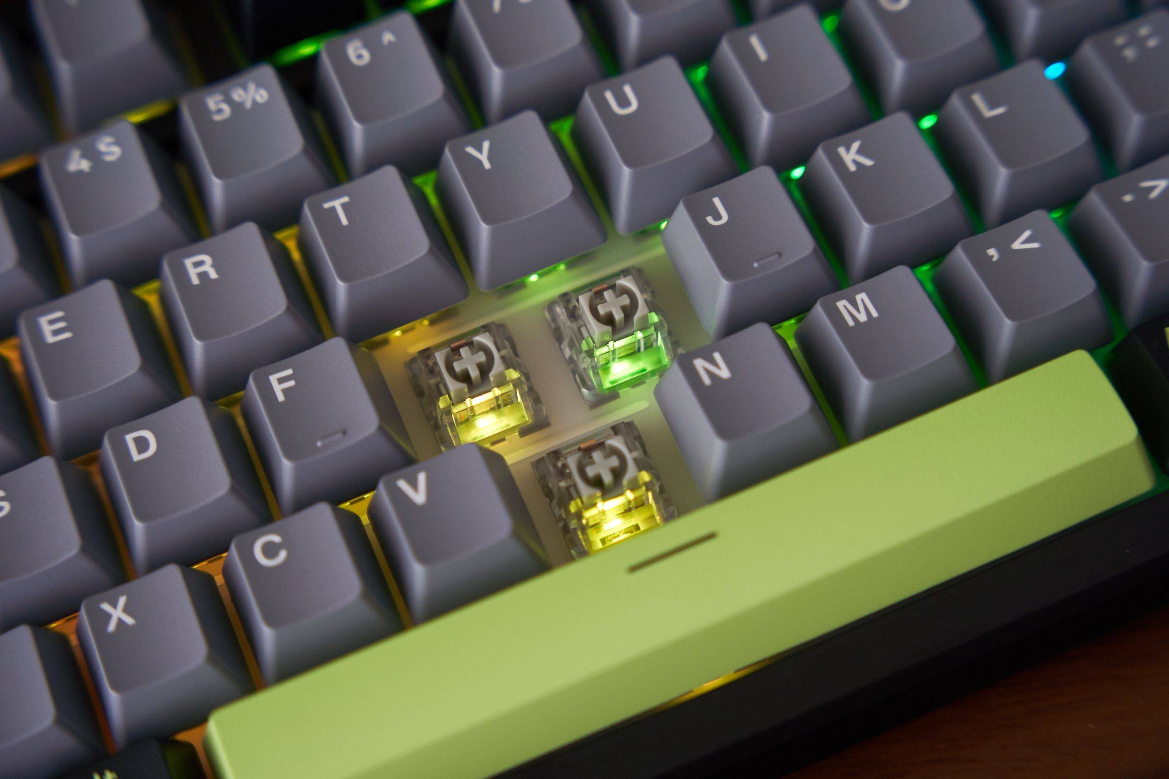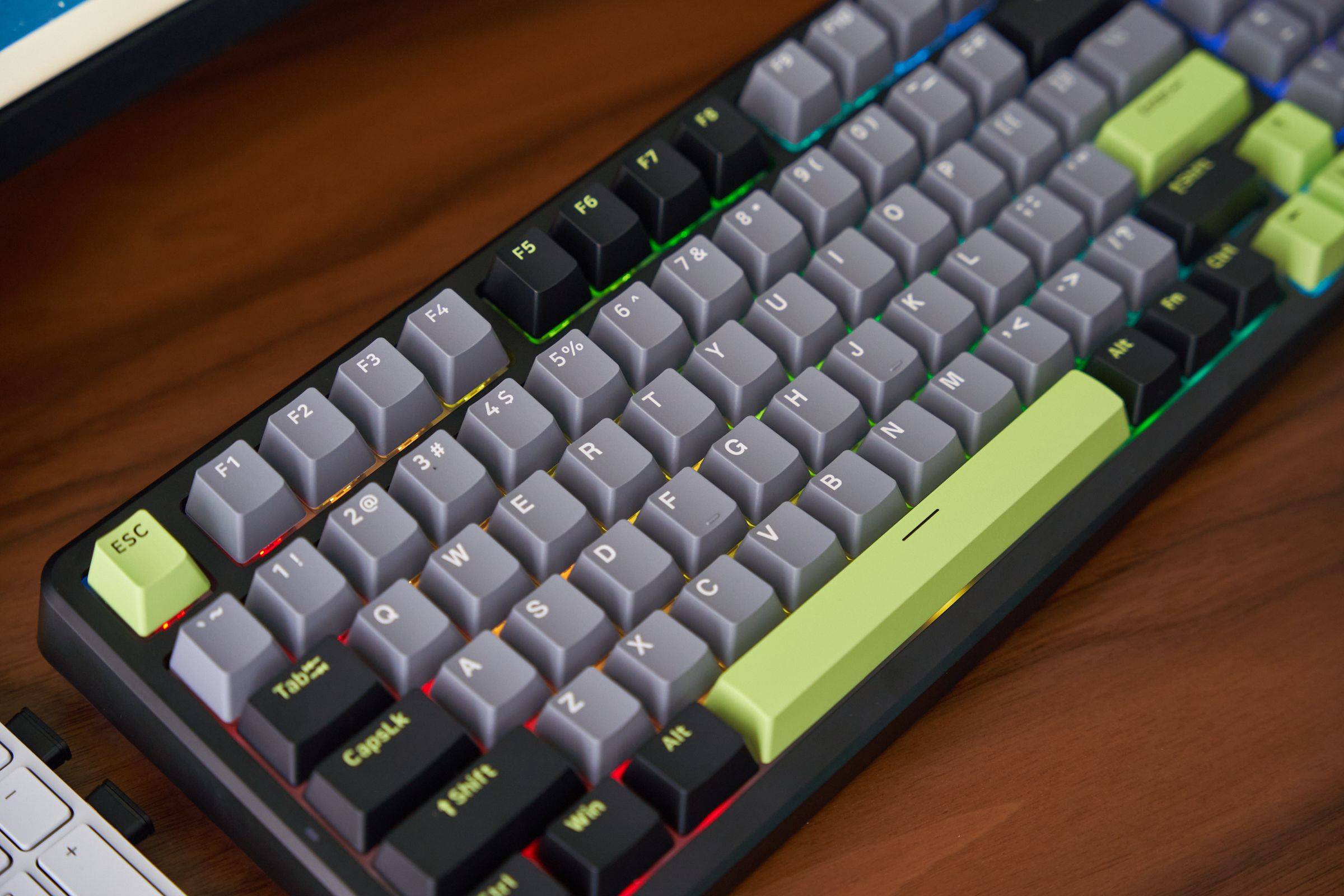 我入手的是「初号骑士」版本,灰黑底色+亮绿撞色键帽,EVA机甲风扑面而来。另有莫奈仙踪(粉色为主)、幻影机甲(蓝色为主)配色可选。