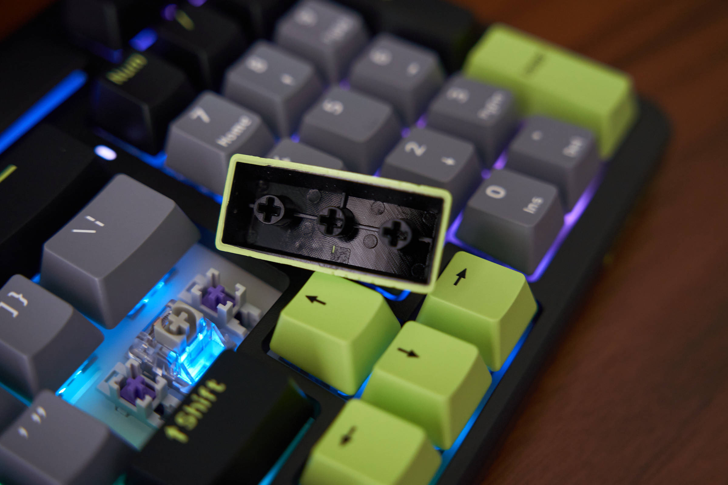 键帽采用高含量PBT材质,磨砂触感抗打油,闭口字符工艺精致。