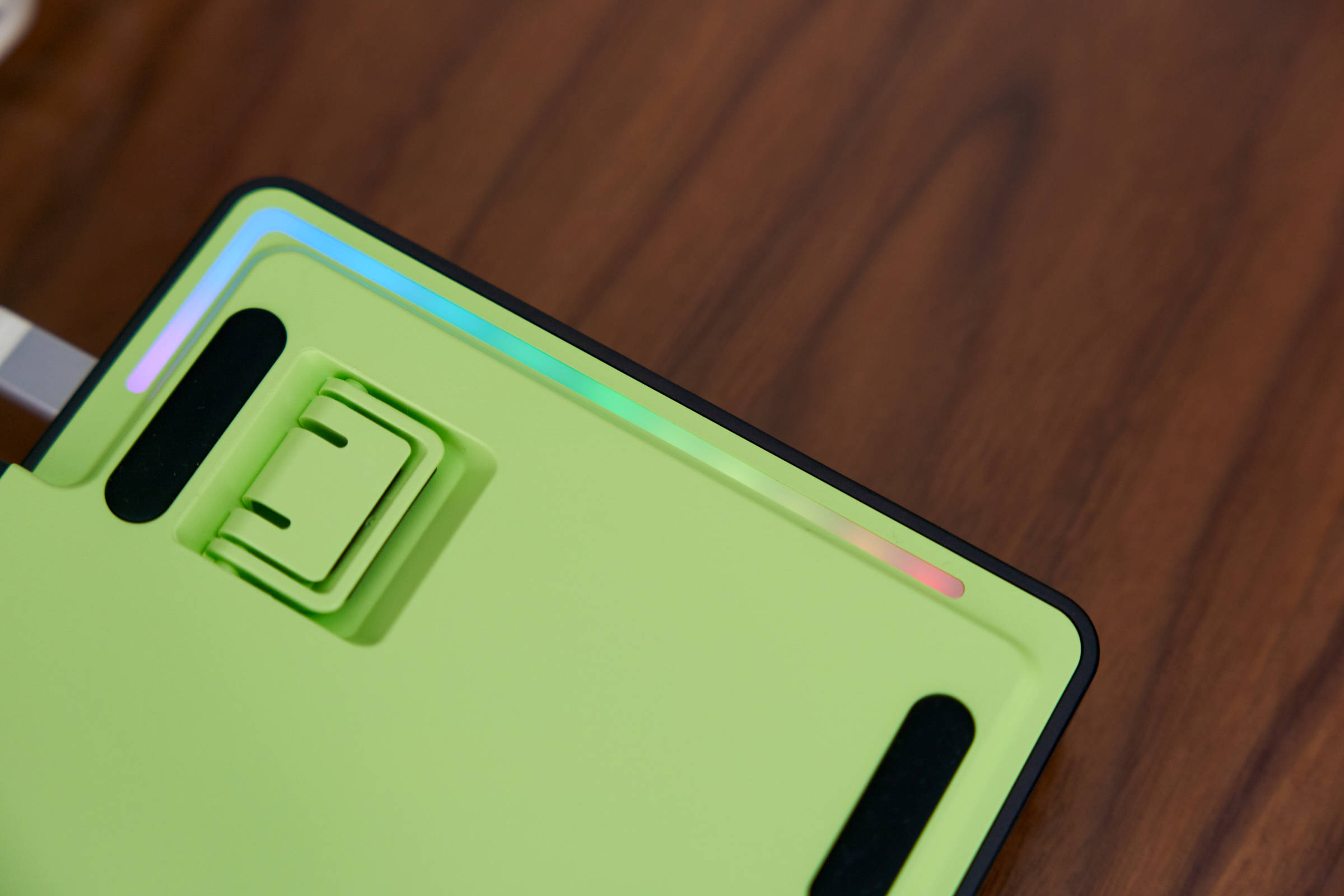 仓口嵌入RGB条装饰灯带,Fn+空格键可实时查看电量(绿/黄/橙/红/红闪烁五档提示),并可通过配套驱动还可自定义装饰灯带的颜色、亮度,兼顾实用与赛博美学。