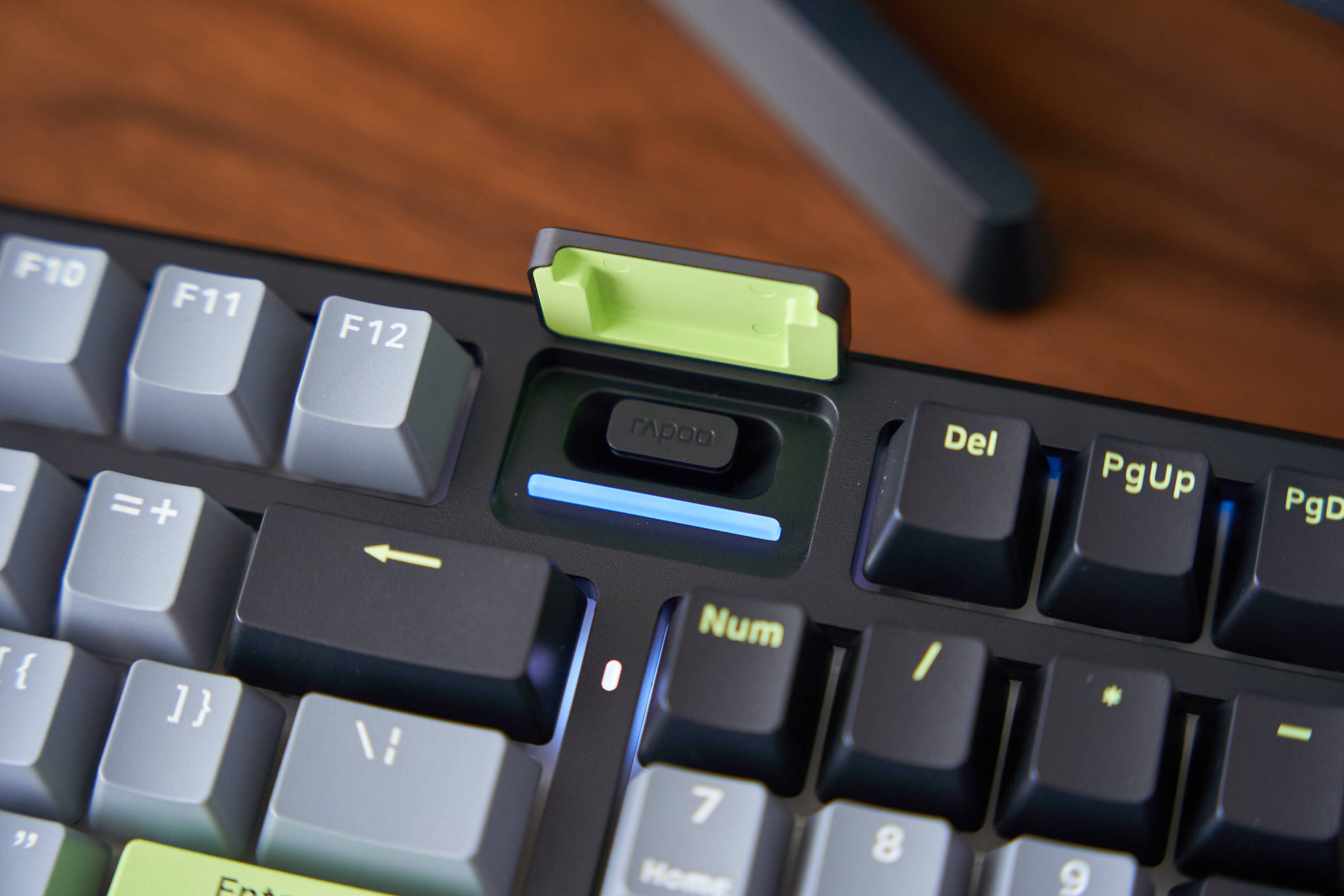 “时空幻境仓”设计巧妙,键盘右上角F键区和删除键之间的小块区域有磁吸盖板,暗藏2.4G接收器收纳仓。