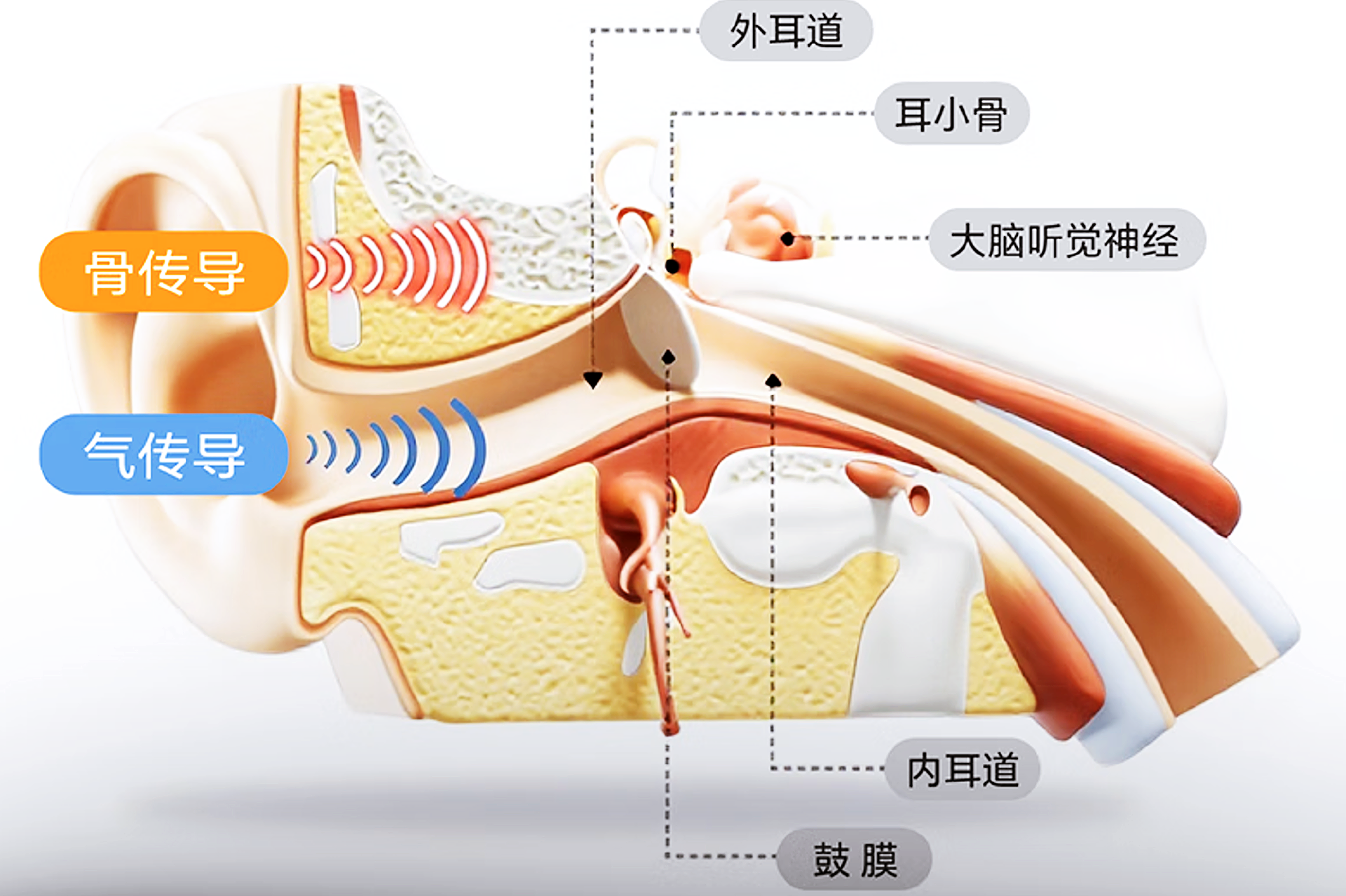 很多人搞不懂气传导和骨传导的区别,这里用一张图简单说明。二者核心差异在声音传输路径:骨传导靠震动传递声音到耳内,所以部分骨传导耳机会配耳塞,捂住耳朵时听感也会更清晰;气传导则接近日常听力方式,声音从外耳道直接传入。作为开放式耳机,它佩戴时不痒、无压迫感,是更舒服、更贴近日常使用习惯的选择。