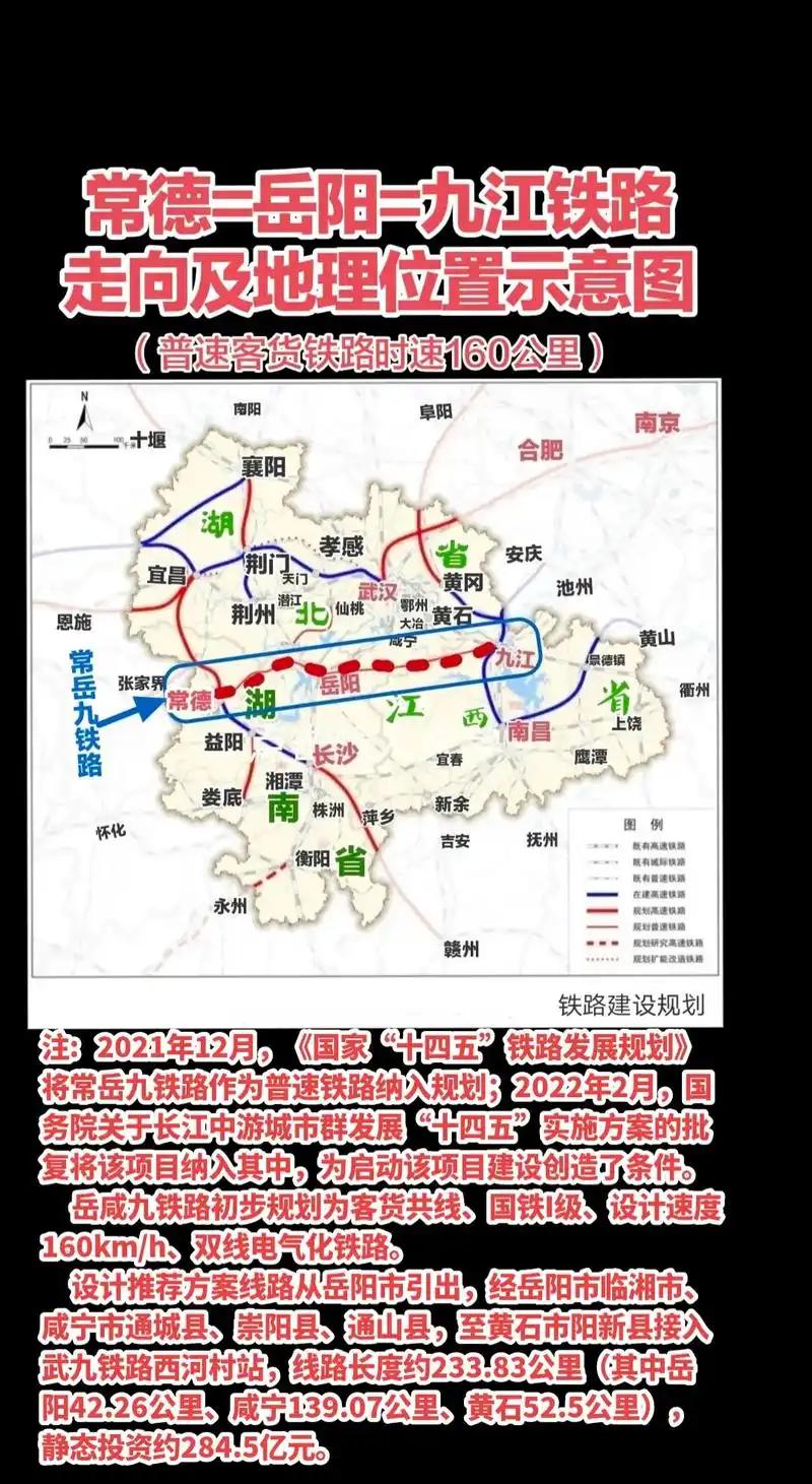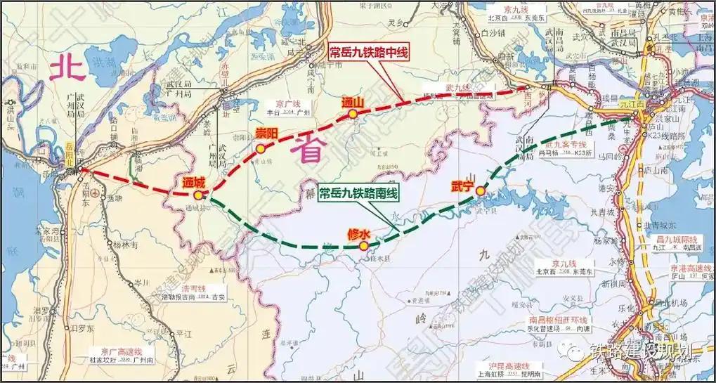 常岳九铁路作为国家《中长期铁路网规划(2016-2030年)》《“十四五”铁路发展规划》及《长江中游城市群发展“十四五”实施方案》中的重点项目,此前因湘鄂赣三省线路走向分歧(湖北主张“北线”经通城、崇阳、通山至阳新,江西倾向“南线”经修水、武宁至九江)、