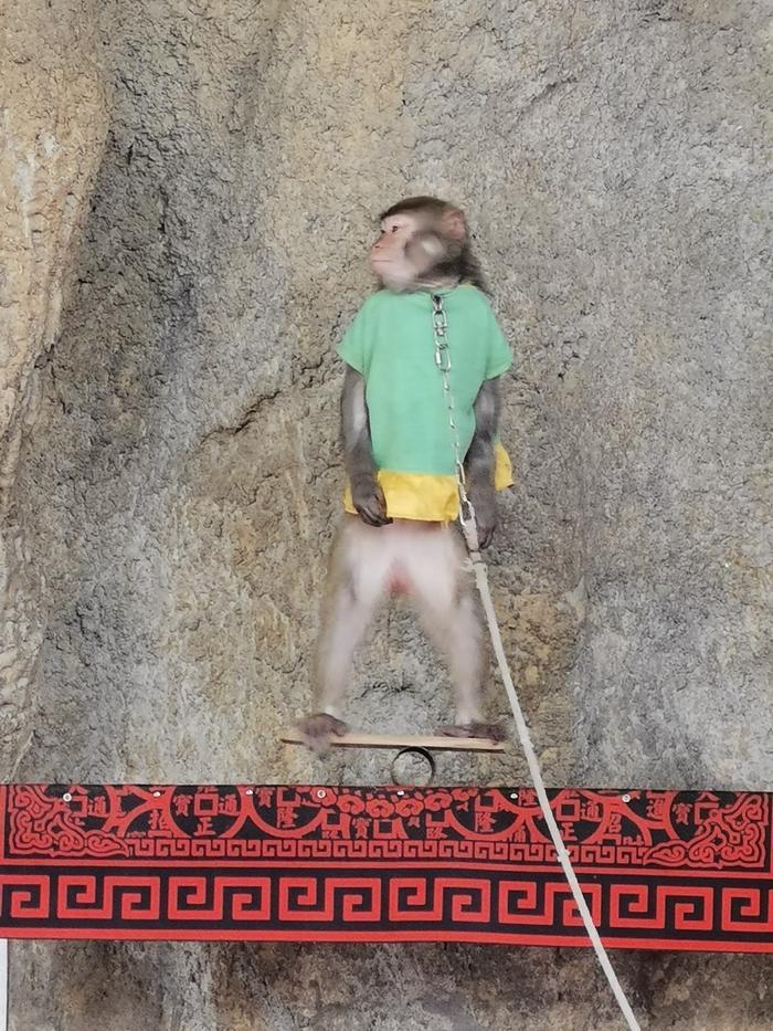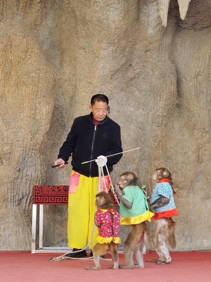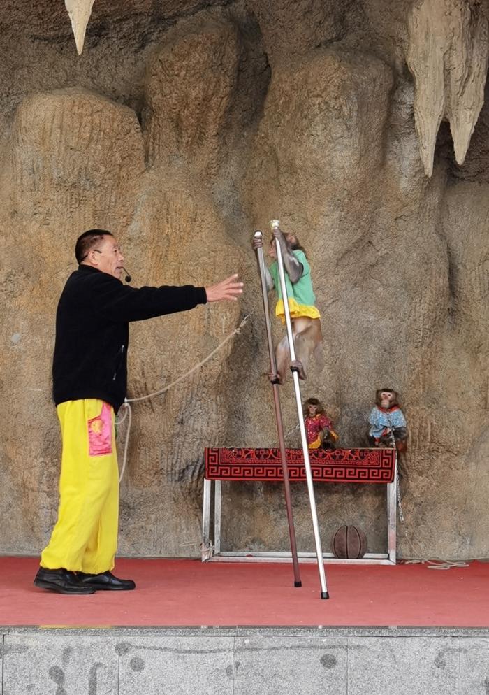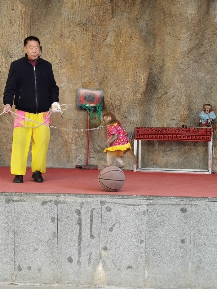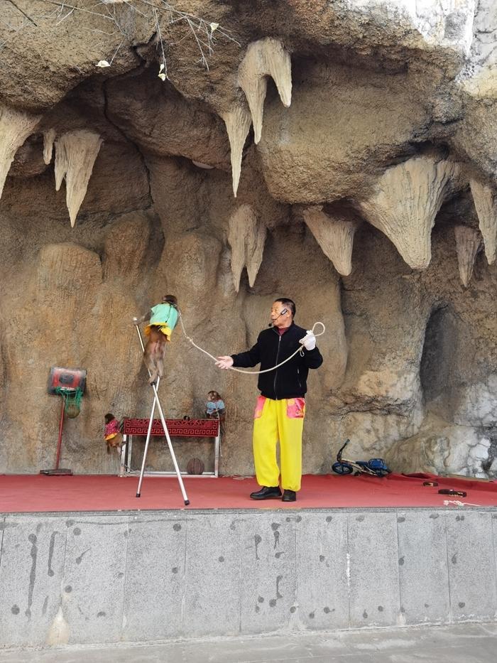 又走了一段路,发现前面有个地方敲锣打鼓,不知是干啥的。走近了才知道,原来这里有一个收费的猴艺表演,门票是25元。我兴致勃勃地买票进去观看。