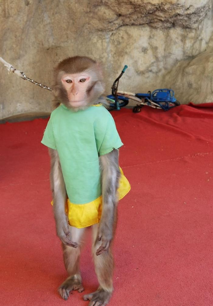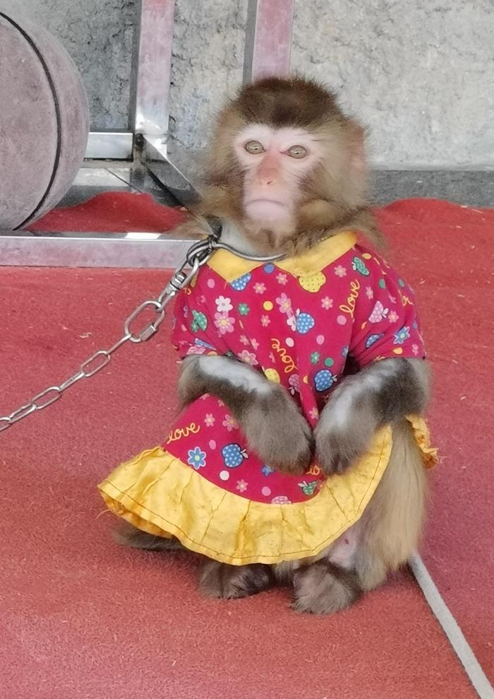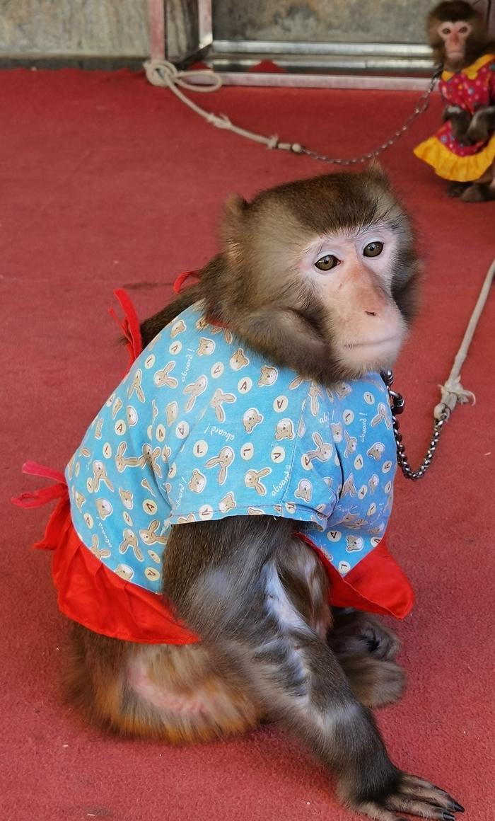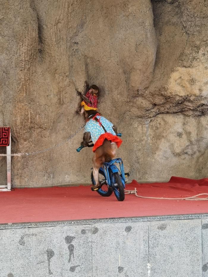 然后就是坐在小板凳上看猴戏,总共3只小猴子,穿着彩色的小衣服,训练有素,会表演骑自行车、升旗、抬轿子、杂技等等,有时,还来点调皮捣蛋的小插曲,这种表演生动有趣,深受游客特别是小朋友的喜欢。    我也兴致勃勃地为可爱小猴子的表演叫好喝彩,为它们拍了照片和视频。
