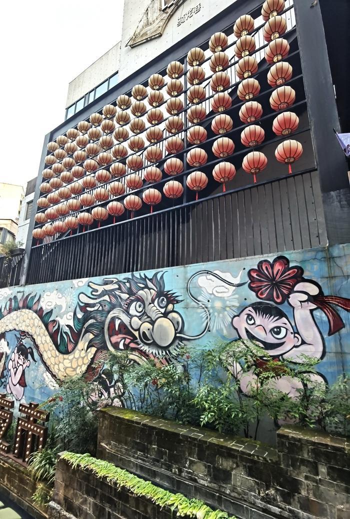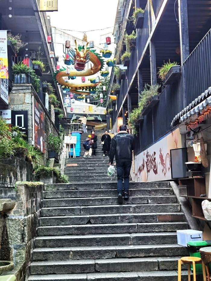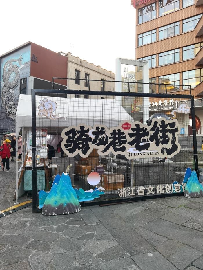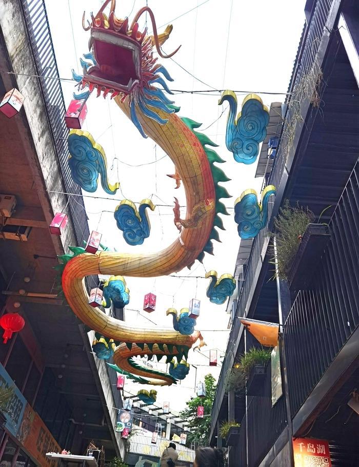 傍晚,我来到了千岛湖的美食街骑龙巷老街。这里的装饰很有特点,一条巨龙腾空而起,街道随处可见龙的图案。