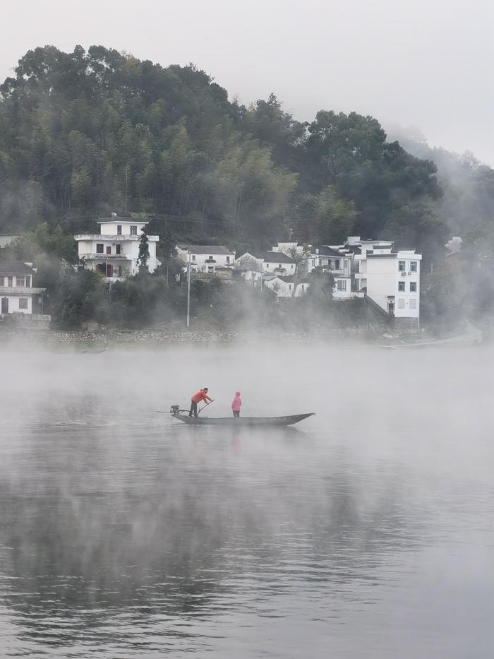 在候船的时候,突然水面上升起白色的云雾,远处的山和村庄云雾缭绕,此时,水面上划来一叶小舟,划船摇橹的人穿着彩色的衣服。大家都被眼前的美景惊呆了,都说仿佛看到了一幅精美的山水画。