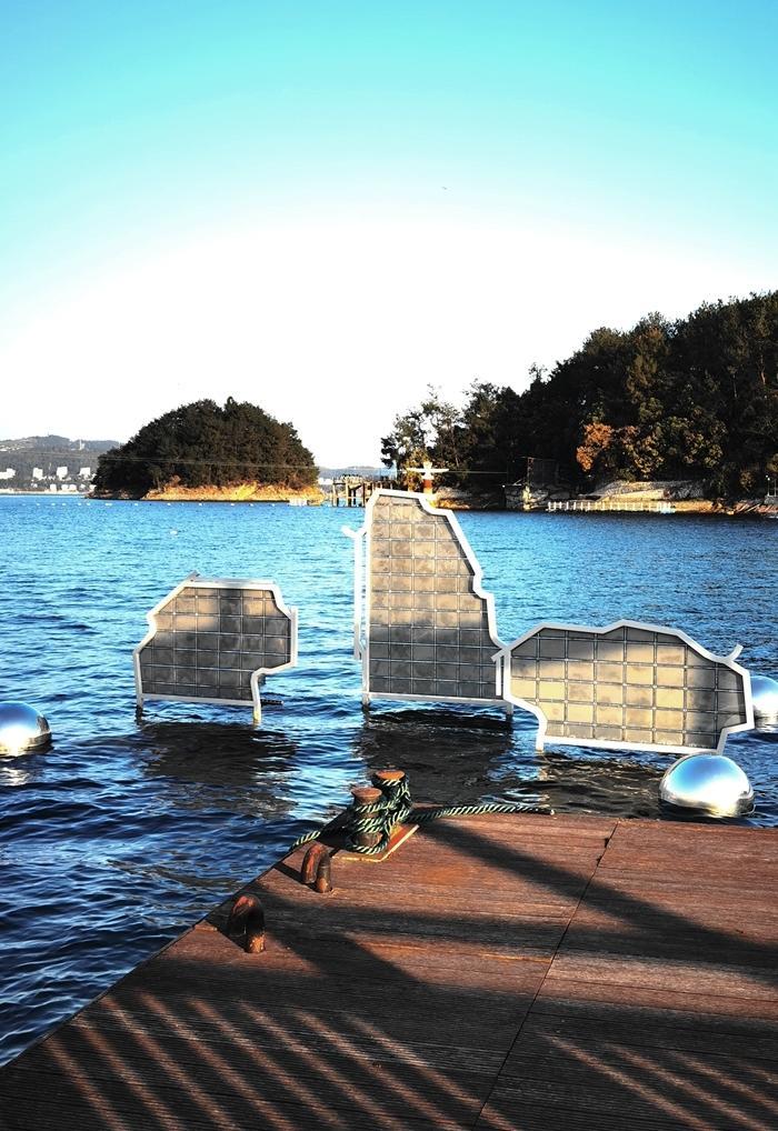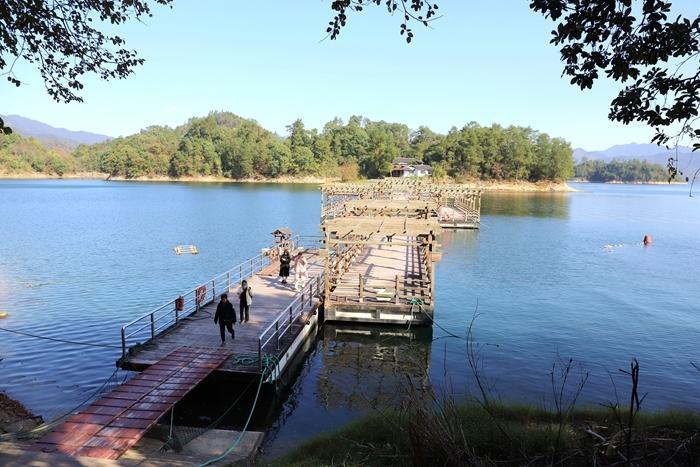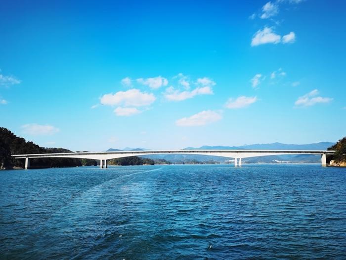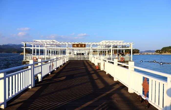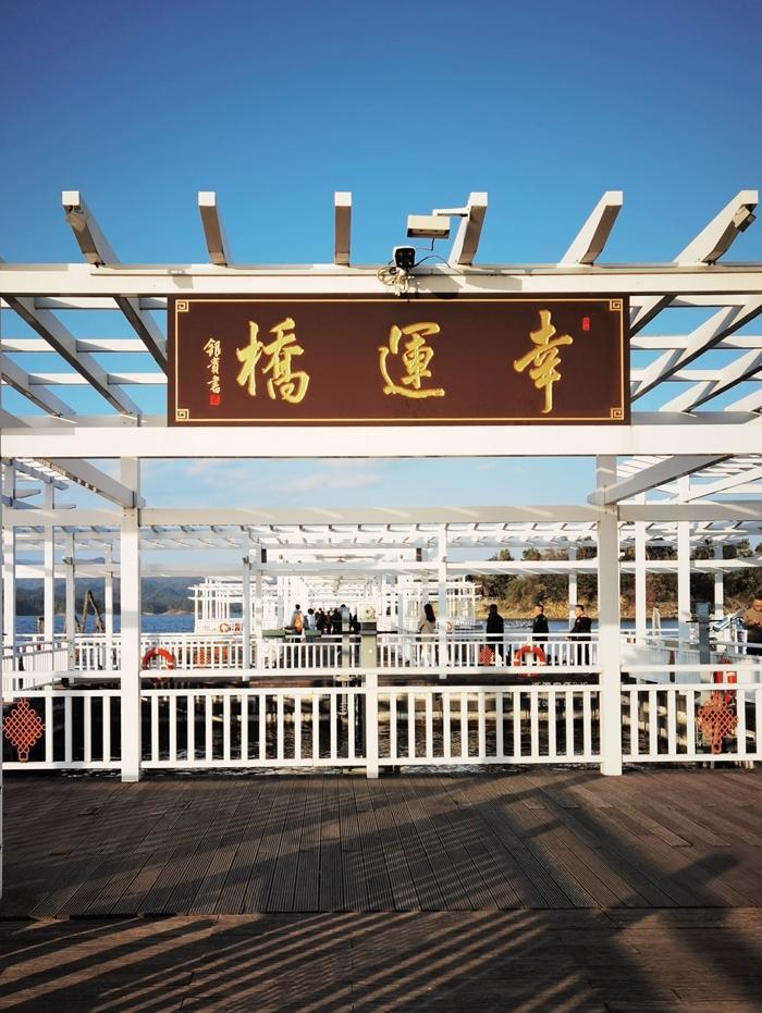 五岛由鱼乐桥、幸运桥、状元桥相互连接。我首先看到的是幸运桥,幸运桥长230米,为国内最长水上浮桥。素有“走过幸运桥祝君走好运”之说。幸运桥连接着系园和心园,千岛湖垂钓中心依桥而建,可在此垂钓、品茗、休闲。