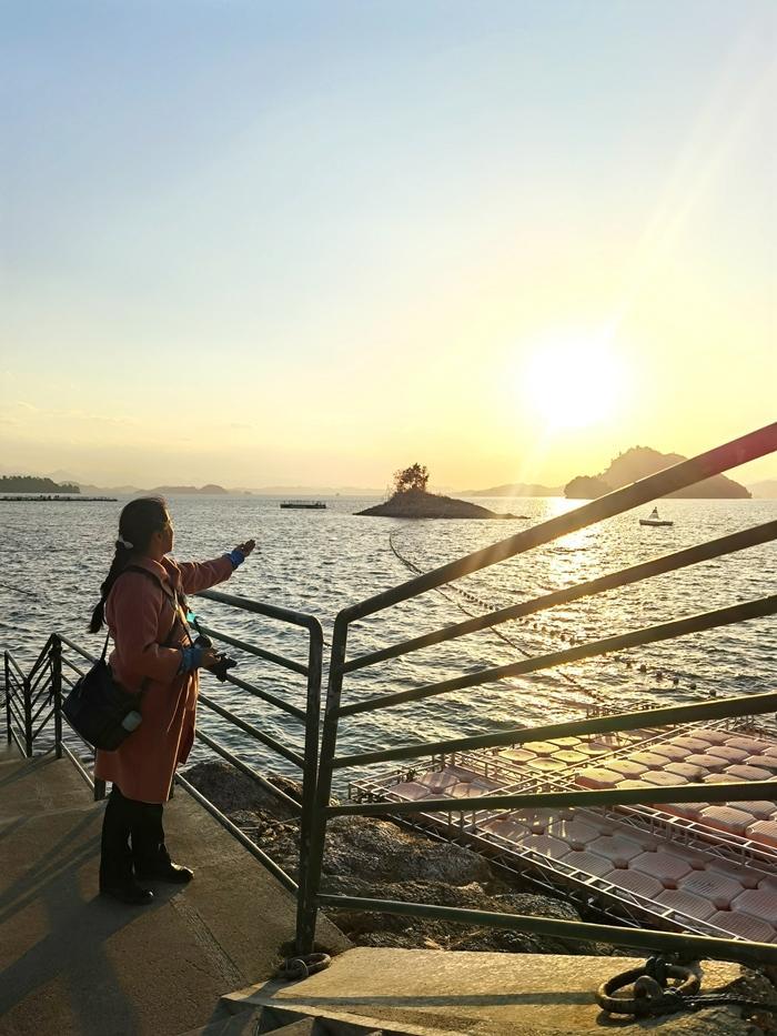 黄山尖一共有两个观景台,即半山观景台和山顶观景台,为游客提供了‌全景视野‌。游客站在观景台上,朝西北方向看,可看到珍珠列岛全景,岛屿如珍珠散落湖面。游客站在观景台上,朝东南方向看,可看到黄山尖与羡山岛间的幽深峡谷。游客站在观景台上,朝西南方看,可看到姥山岛及一望无际的湖面。