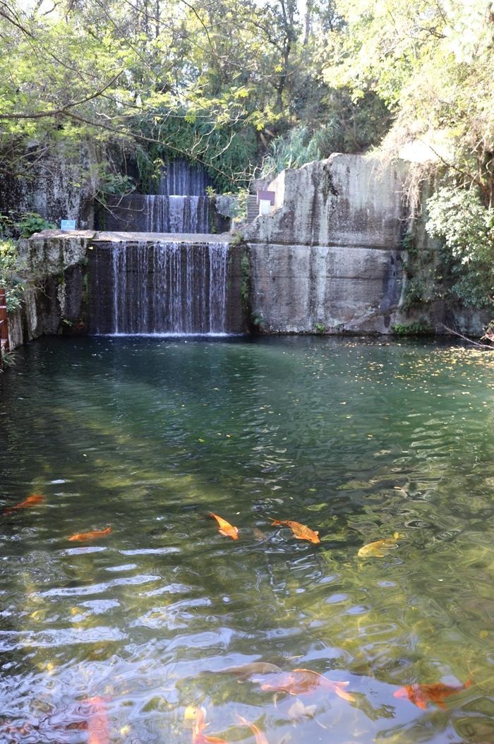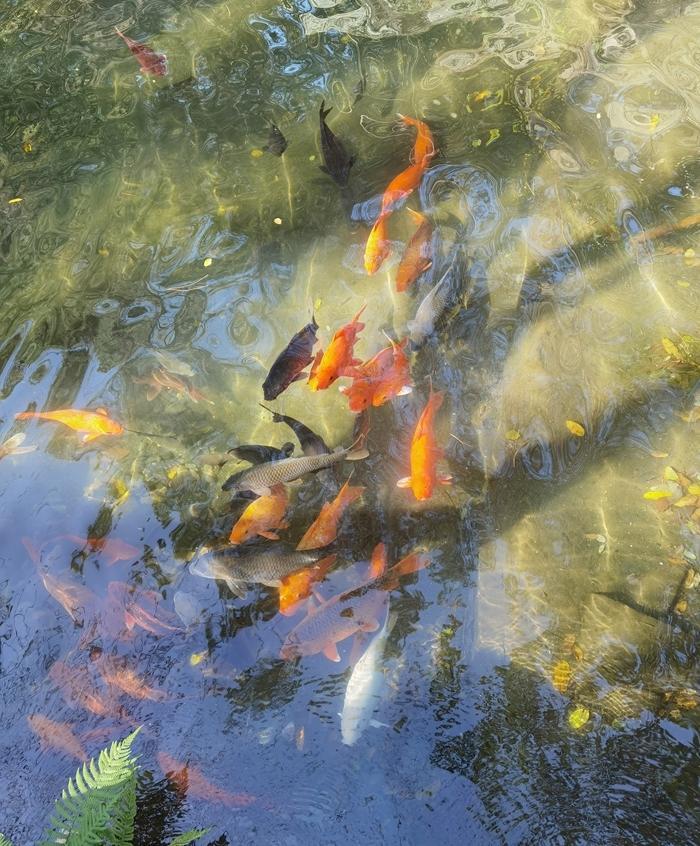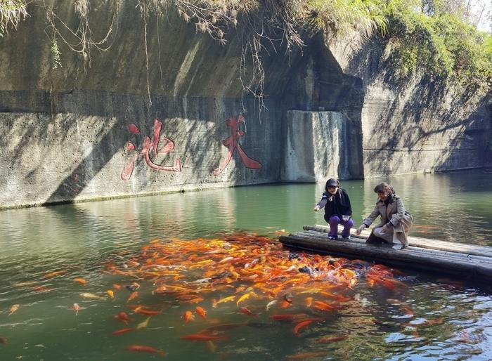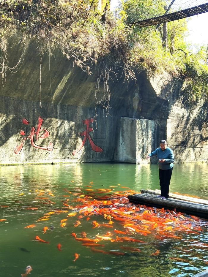 石池经雨水积蓄形成天然水体,现养殖鲤鱼、草鱼等观赏性鱼类。石壁保留着开凿时的钎痕,西北侧可见长达80米的完整采石作业面。    过去采石场现在变成了一个个养鱼池和一层层瀑布,风景优美如画。    养鱼池里养了很多鱼,在天池岛观鱼喂鱼是一个很有趣的旅游项目。