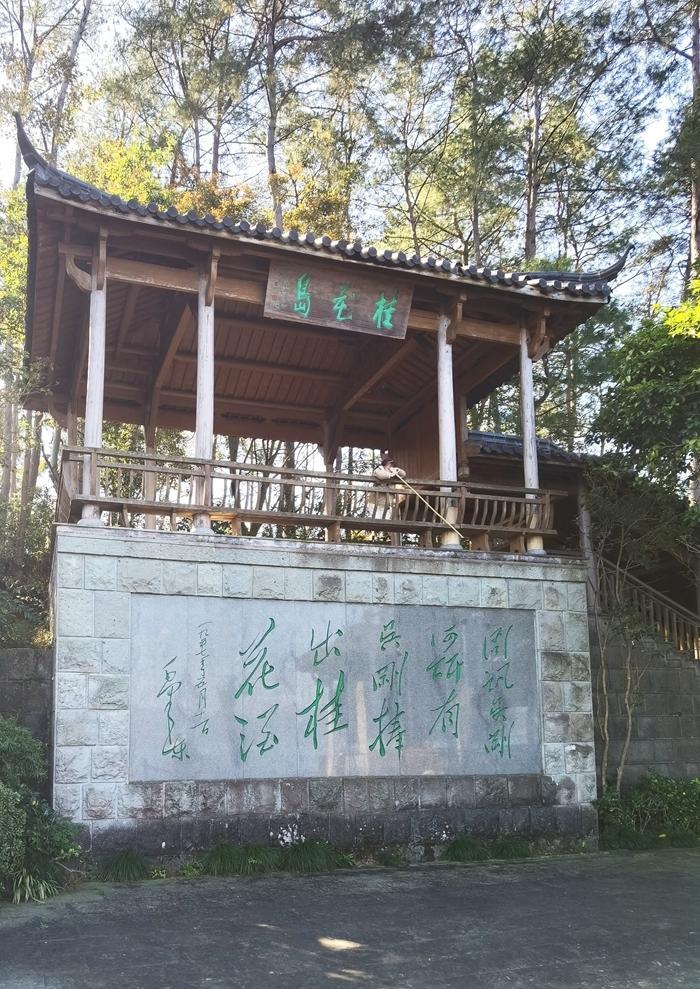 我们上的第一个岛叫桂花岛。    桂花岛又叫龙羊山,面积约0.2平方公里,主要有松林、桂花和石岩3个自然景区组成。前档景墙上镌刻的“问讯吴刚何处有,吴刚捧出桂花酒”,出自毛泽东同志的诗句《蝶恋花》。