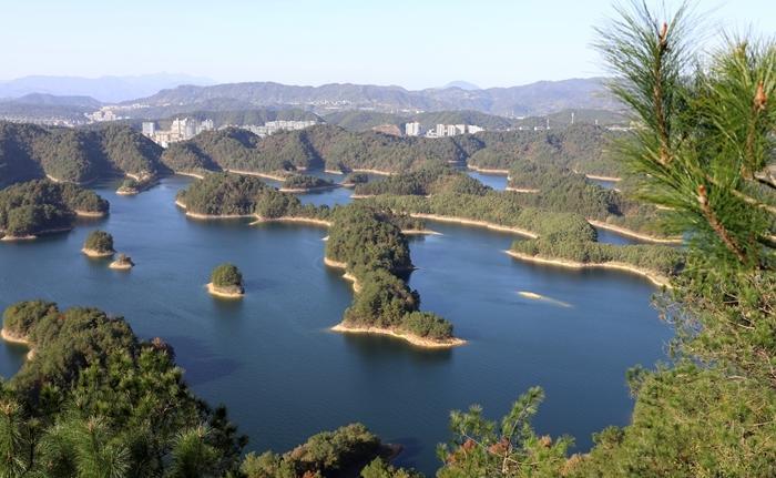 千岛湖风景区 ,也叫新安江水库,位于浙江省杭州市淳安县境内。千岛湖是为建新安江水电站拦蓄新安江上游而成的人工湖。新安江水库建成后,大坝将新安江上游拦截成一个巨大的湖泊。崇山峻岭淹入湖中成为大小岛屿,共1078个,故名“千岛湖”。当年,因兴建新安江水电站,两座本地的千年古城“狮城”和“贺城”也在一夜间被淹没在这片碧波之下。