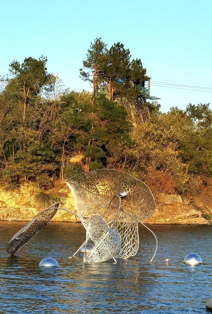 下了缆车,再步行一小段,便来到黄山尖的山顶观景平台,凭栏远眺,可以看到一串串曲折回环的岛屿,如同一颗颗珍珠撒落在湖面,或大或小,或长或短,美不胜收。让人惊奇的是这些岛屿竟然巧妙地排列成了“天下为公”四个大字,气势宏大,荡气回肠,堪称天下奇观。