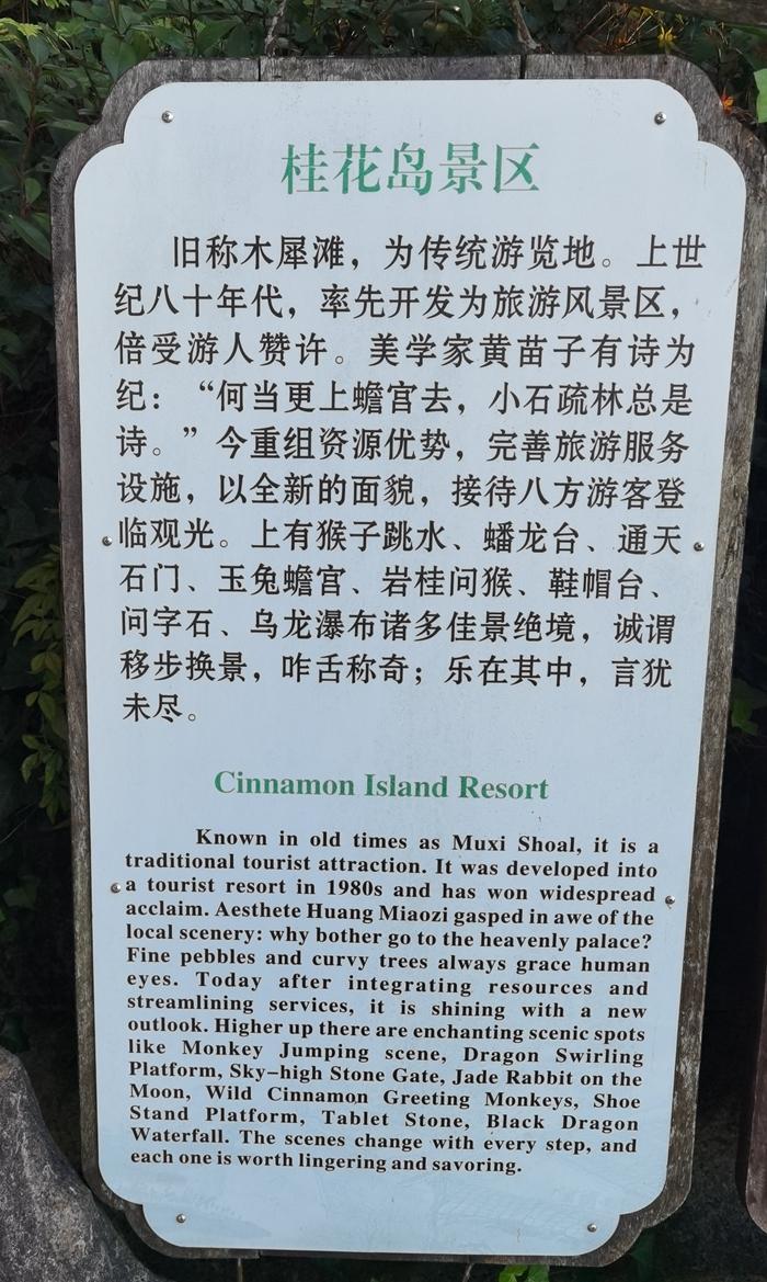 岛上野桂有金桂、银桂、丹桂和四季桂等多个品种,并且年代久远。喀斯地貌是由石灰岩经过亿万年雨水侵蚀雕刻而成的,岛上的喀斯地貌极为丰富,有观岛台、乌龙出水、蟾宫仙坞、通天石门等景观。此外,桂花岛还借助岛上的资源优势,开发了桂花酒、桂花糕、桂花茶等一系列桂花产品。    桂花岛还有一个名字叫猴岛,刚上岛没多久,就遇到了一大群猴群。大家买了一些食品,兴高采烈地喂起猴子来。    猴子们上下翻滚,你争我抢,把大家逗得哈哈大笑,猴子们也饱了口福。