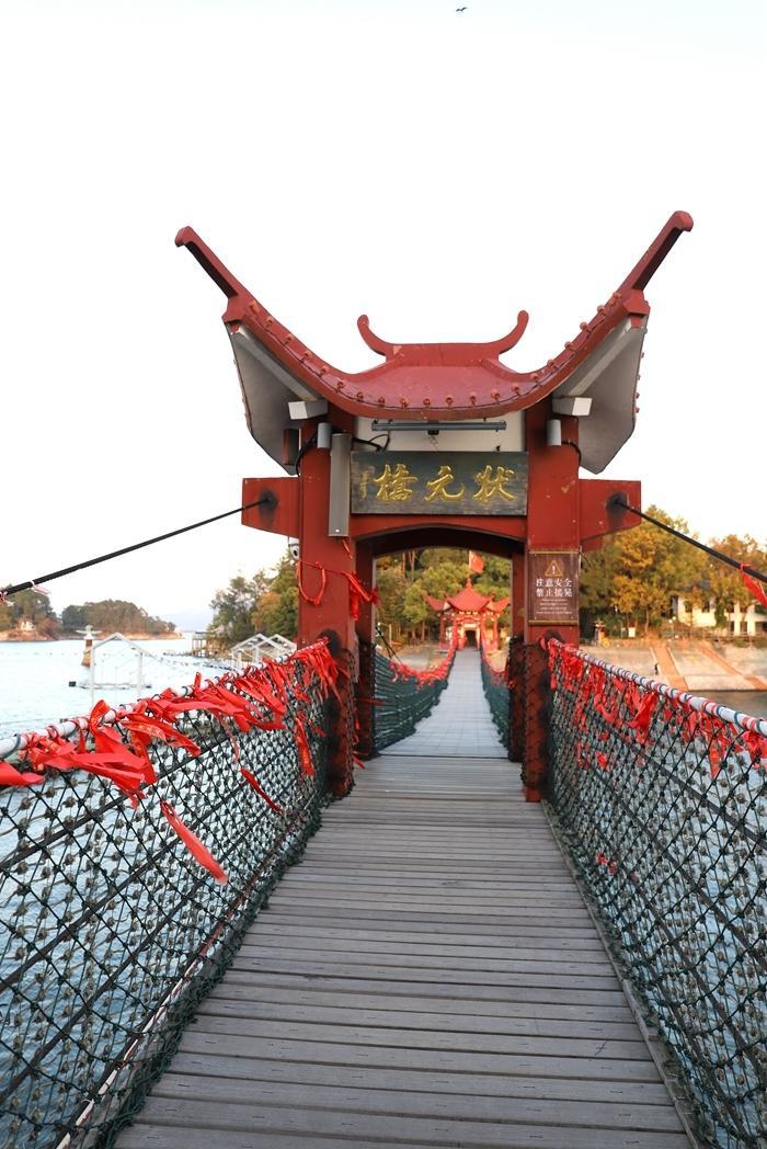 我来到状元桥。状元桥是明朝政治家商辂的母亲,在儿子中状元后,为还愿而建的桥。老桥因年久失修,现在已经不存在了。现在的状元桥是一条重建的钢索桥,是为纪念“三元宰相”商辂及方逢晨、詹睽等三状元而建。人称“状元桥上走一走,高中状元就是我”。