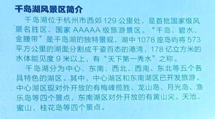 千岛湖是国家5A级旅游风景区,也被称为天下第一秀水。千岛湖分东南湖区、中心湖区、西北湖区、西南湖区、东北湖区、和石林景区六个主要游区。