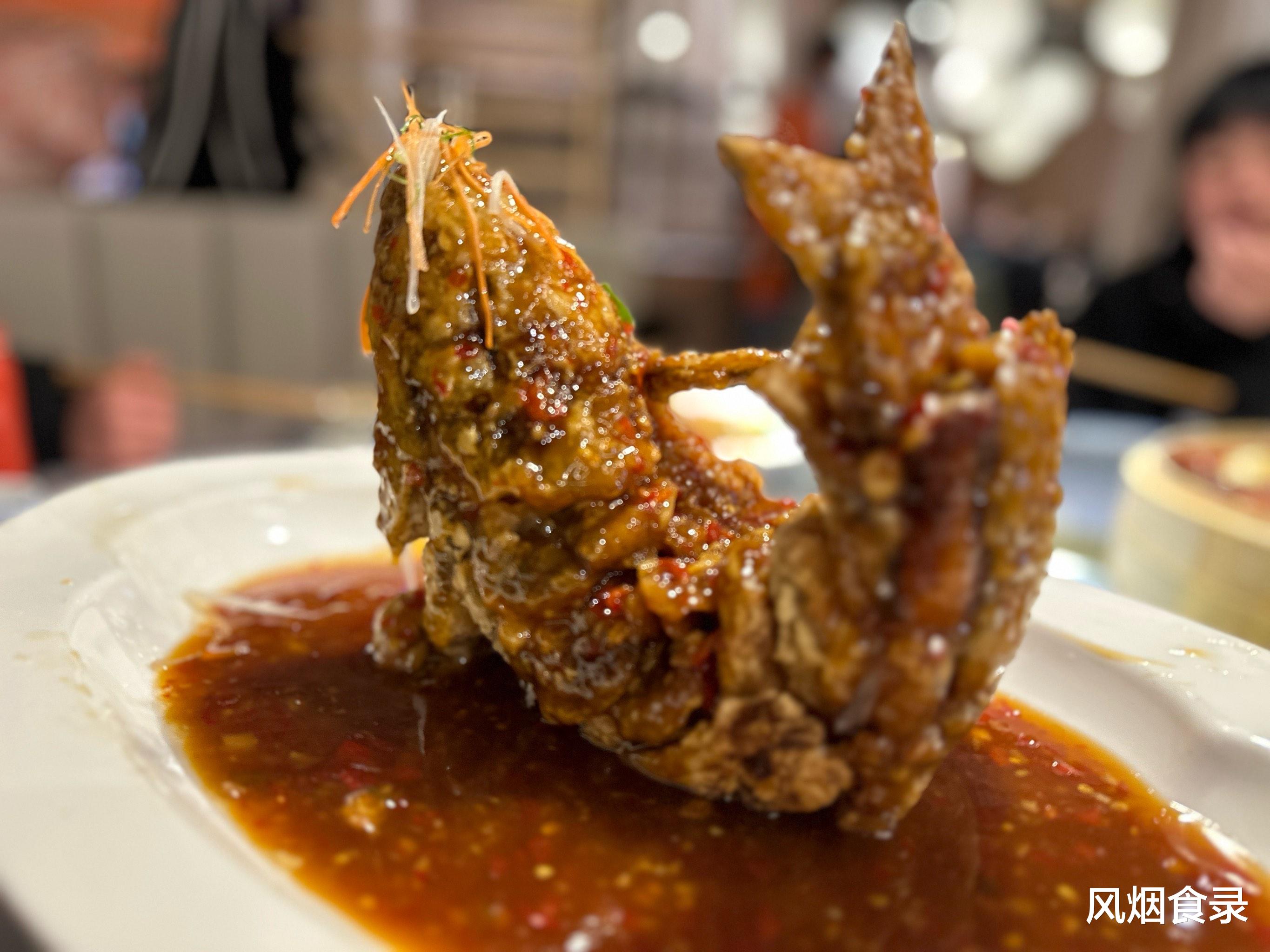 1.5公斤的鲩鱼改牡丹花刀,腌足15分钟醪糟盐,炸得金黄酥脆,淋上泡椒熬的糖醋汁,鱼头朝向长者,寓意“年年有余”“金玉满堂”。