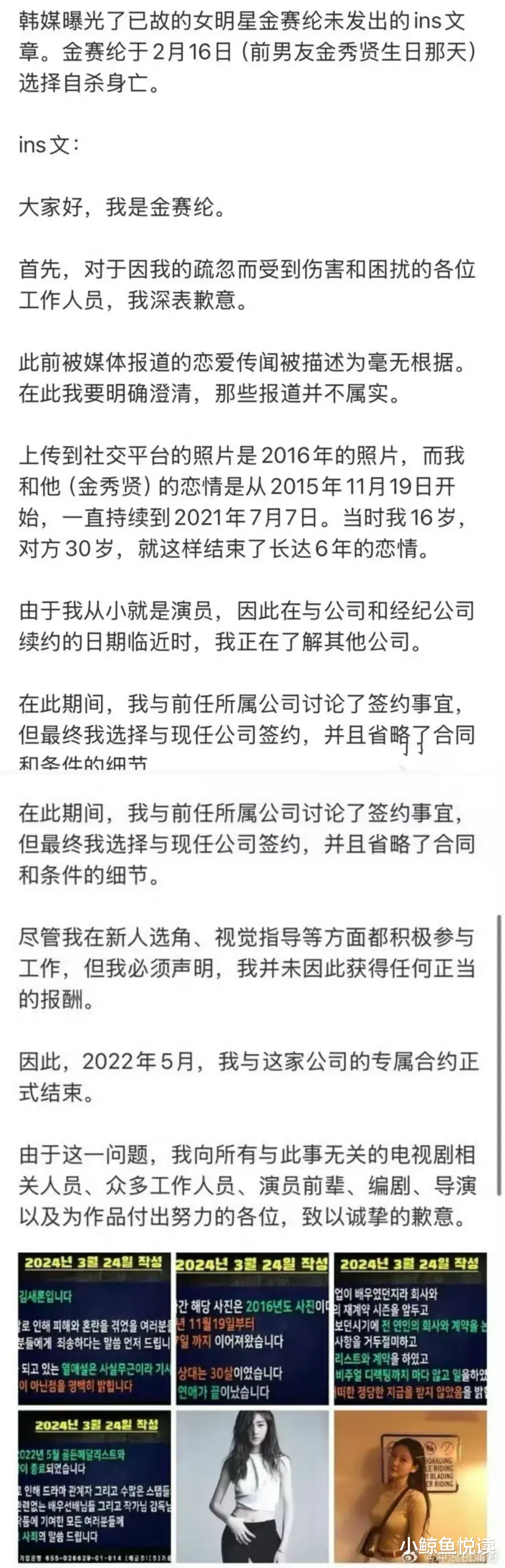 “我和他(金秀贤)的恋情是从2015年11月开始,一直持续到2021年7月7日,当时我16岁,对方30岁,就这样结束了长达6年的恋情。”