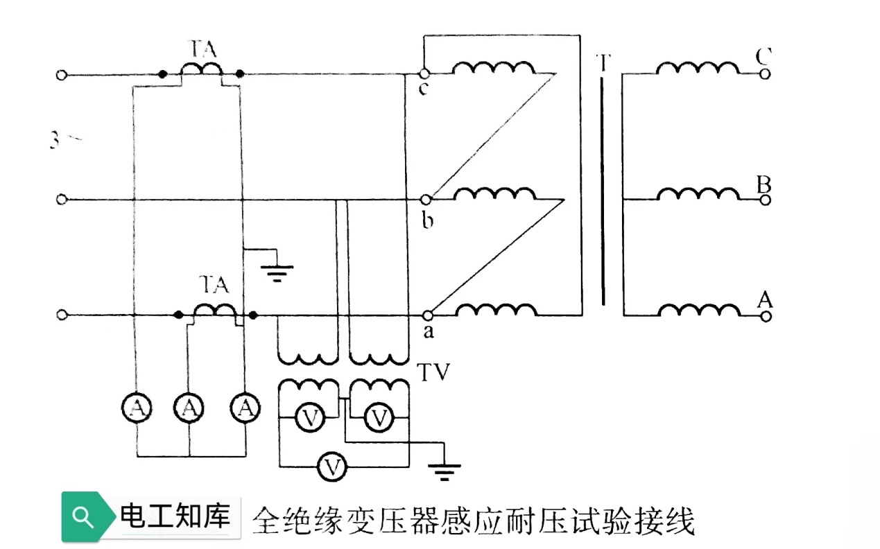 全绝缘变压器的感应耐压试验可按下图所示的接线,施加2倍及以上频率的2倍额定电压进行试验。这种接线只能使线间达到试验电压,对中性点和绕组还需进行一次外施高压主绝缘耐压试验。纵绝缘是否承受住了感应耐压,还需要根据试验前后的空载损耗测试值的比较来判断。