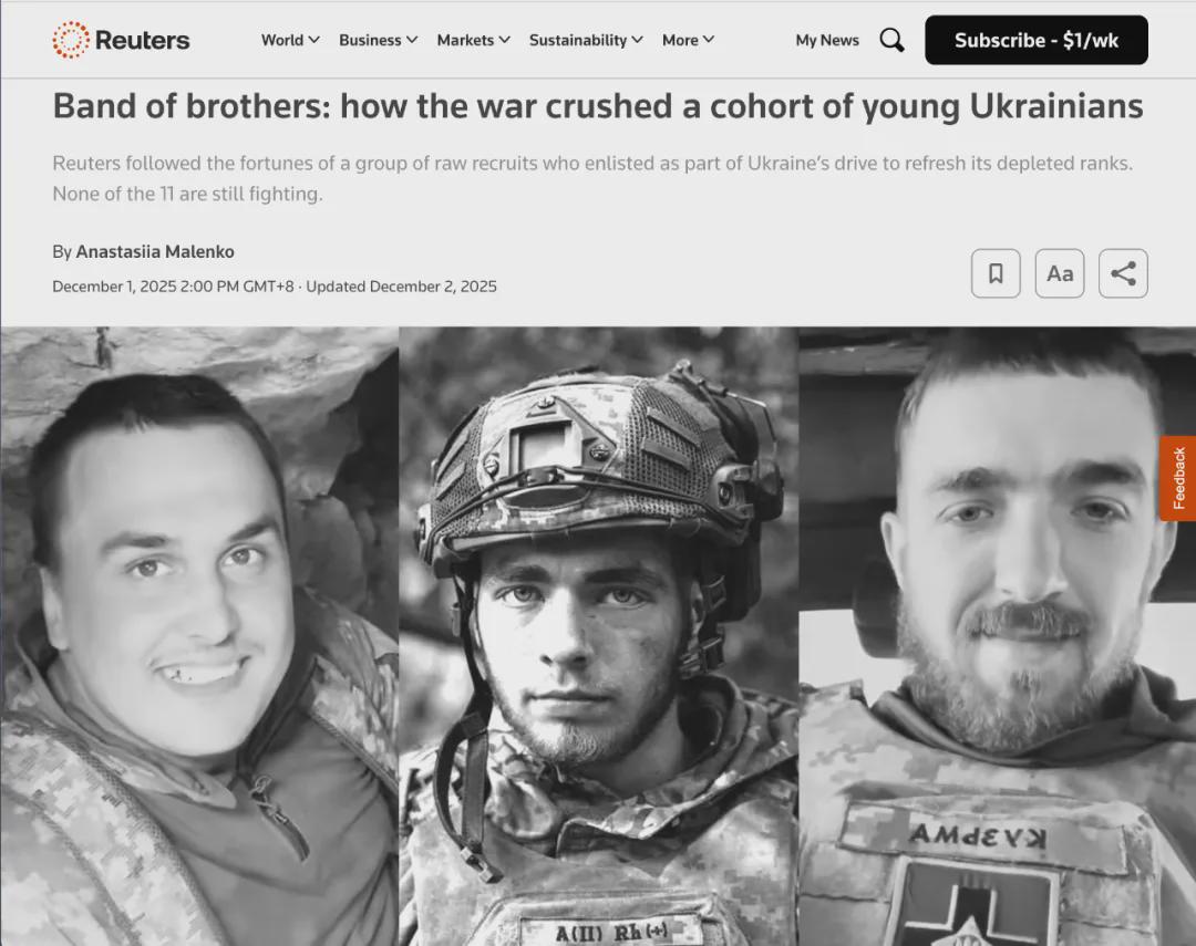 2025年12月1日,路透社发布了一篇名为《兄弟连:战争如何摧残乌克兰一代年轻人》的文章,该文讲述了路透社年初追踪了11名通过“青年合同”加入乌军的志愿者,如今现状如何。
