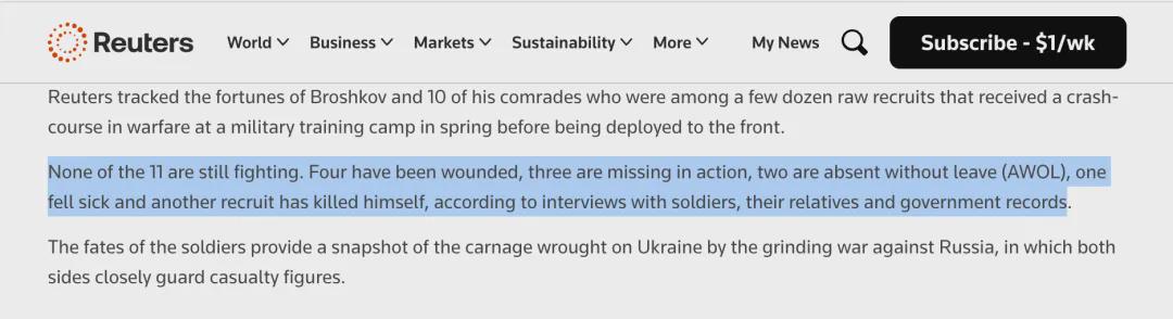 在最新的追踪报道中,路透社称,这11名通过“青年合同”加入乌军的志愿者,目前有4人重伤、3人失踪、2人逃兵、1人生病和1人自杀,而这只是乌克兰士兵的一个缩影而已。