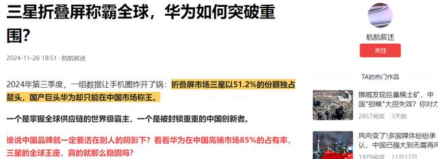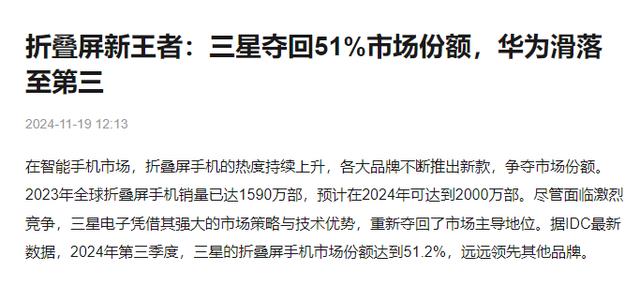 华为和三星都有三折叠手机,虽然三星的宣传力度不如华为大,但是其市场占比要远远高于华为。在2024年第3季度时,三星三折叠手机市场占比为51%,成为全球第一,华为在同时期仅仅只获得了13.2%的市场占比,降为全球第三。