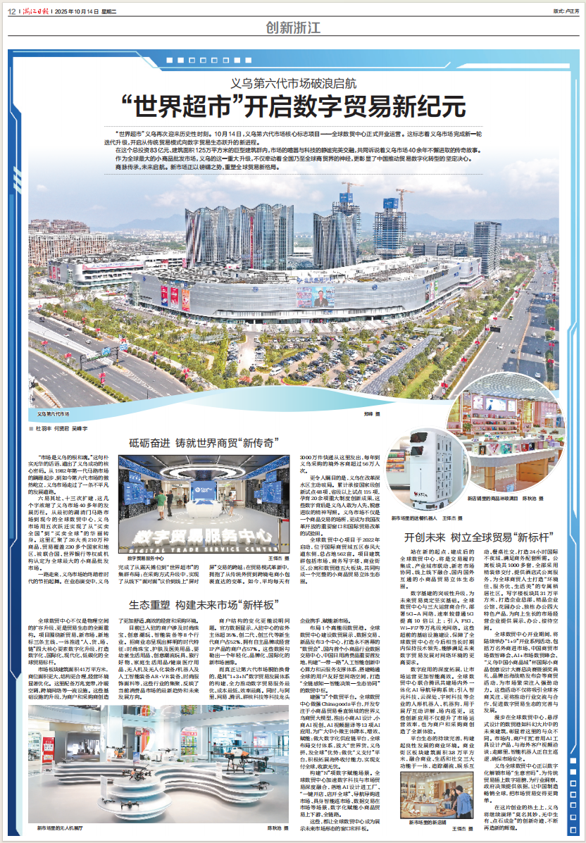 “世界超市”义乌再次迎来历史性时刻。10月14日,义乌第六代市场核心标志项目——全球数贸中心正式开业运营。这标志着义乌市场完成新一轮迭代升级,开启从传统贸易模式向数字贸易生态跃升的新进程。