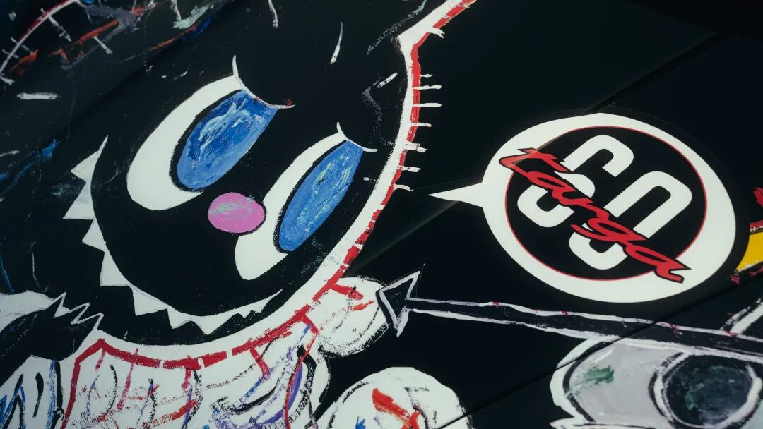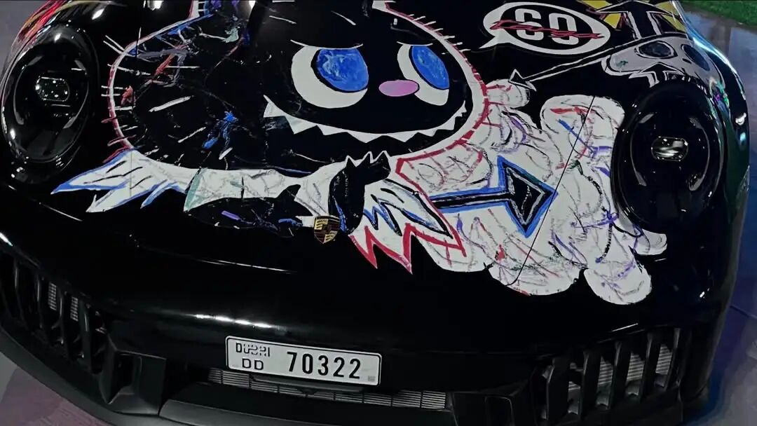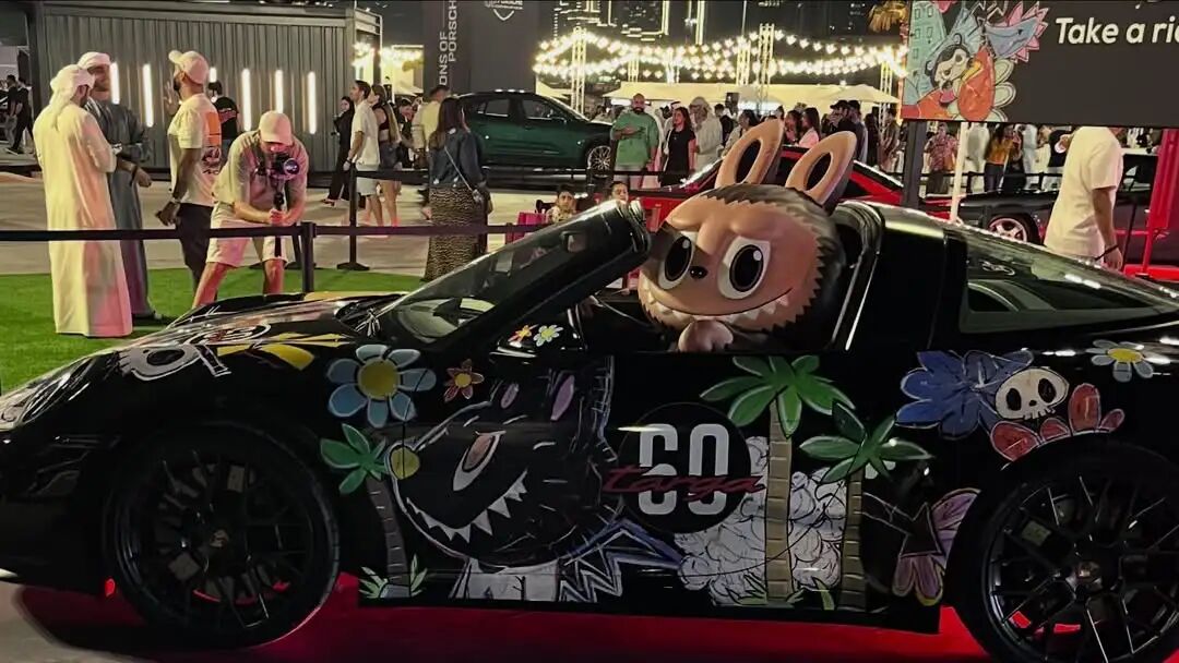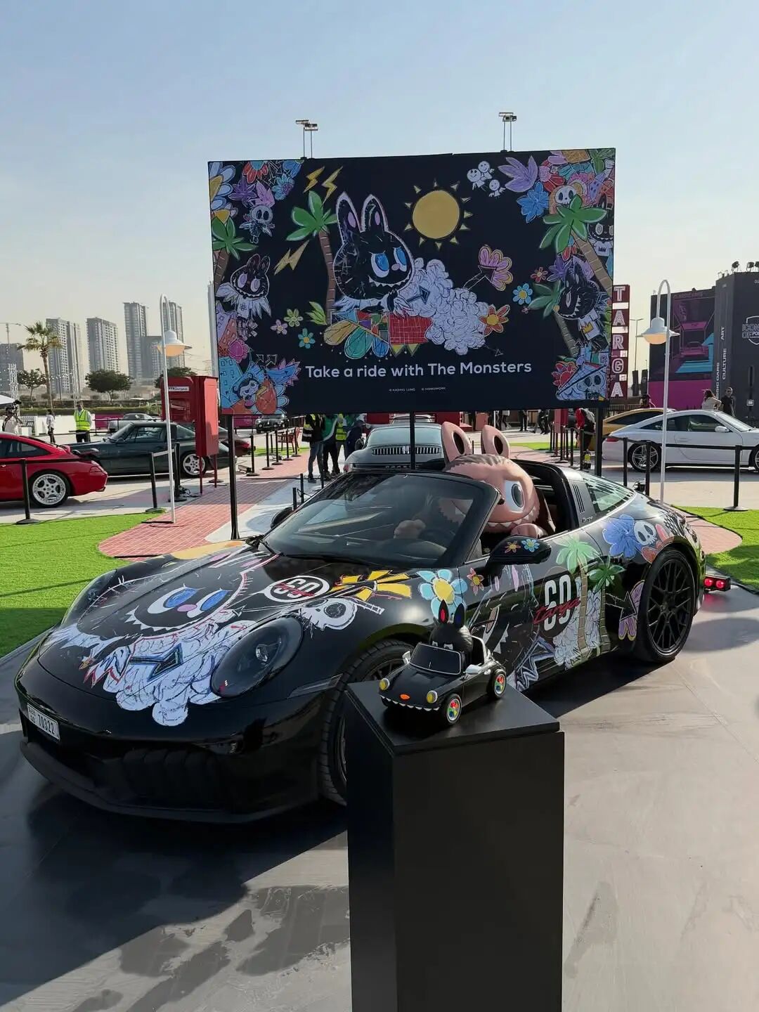限量雕塑呈现的是King Mon驾驶复古迷你Targa的形象,而一件等比例的Labubu雕塑则坐进了艺术车——一辆911 Targa(992代)的驾驶舱。身着保时捷T恤的Labubu成为本届“Icons of Porsche”活动的又一亮点。龙家升还从迪拜举办地汲取灵感,为这台跑车设计了Labubu风格涂装。