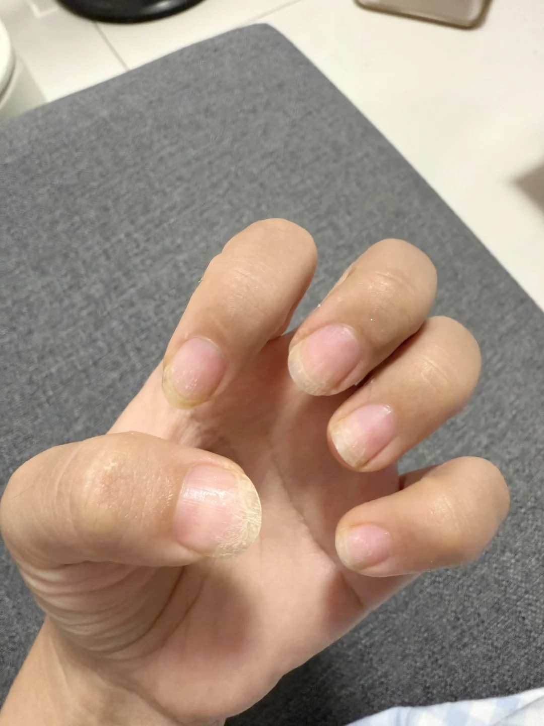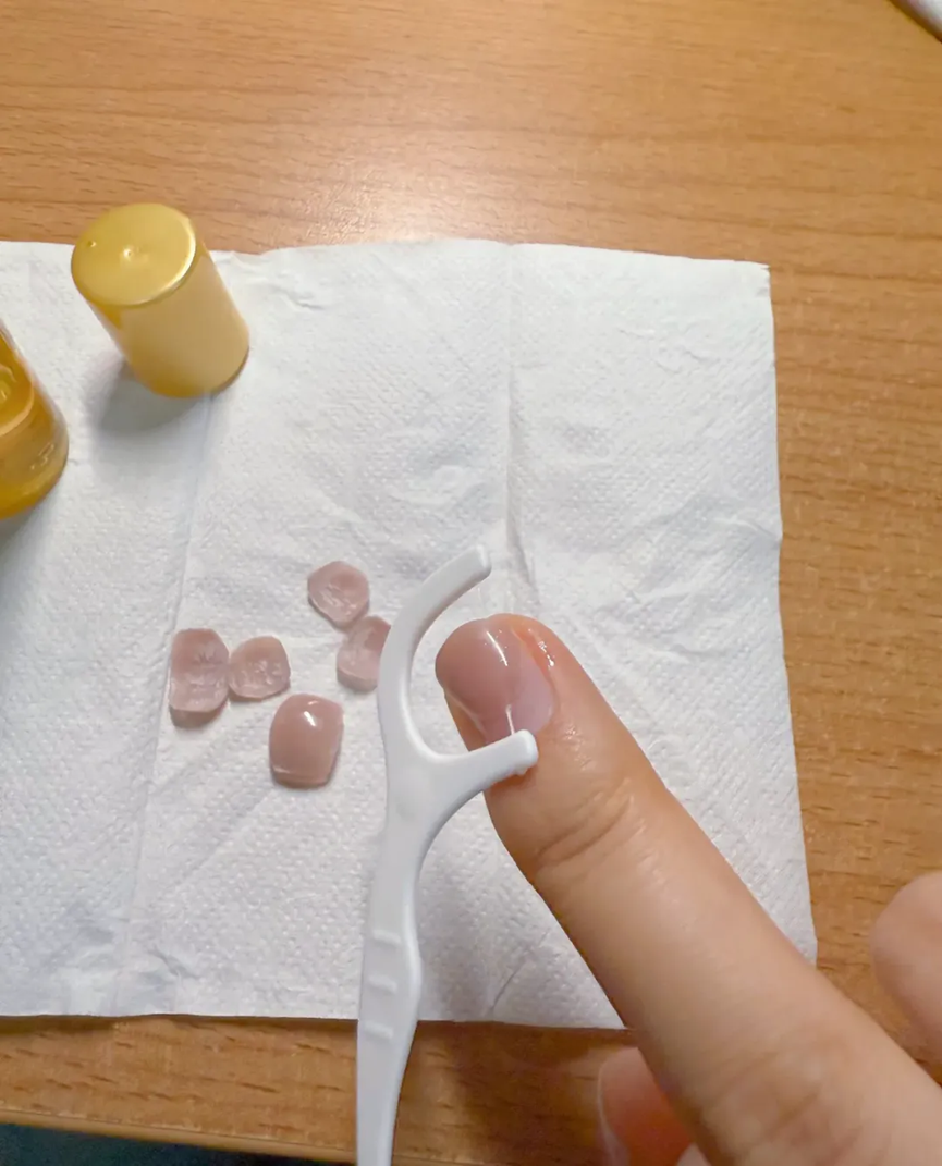 再将牙线塞进美甲的边缘。拉锯式的一点点轻轻拉扯,就能够将甲油胶直接剥脱了。