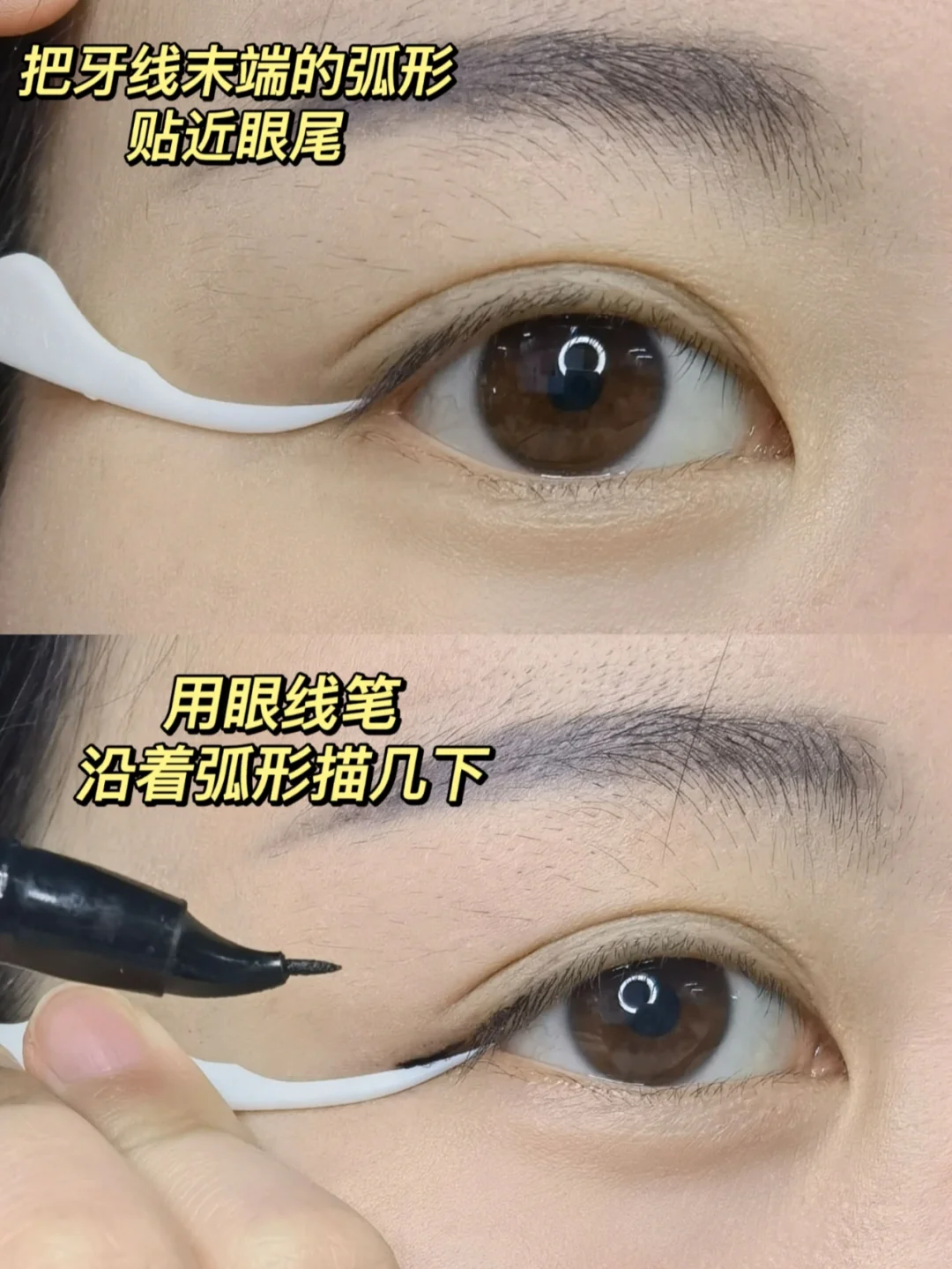 首先使用牙线末端的弧尾贴近眼尾的位置,然后用眼线笔沿着弧形的地方描两下。