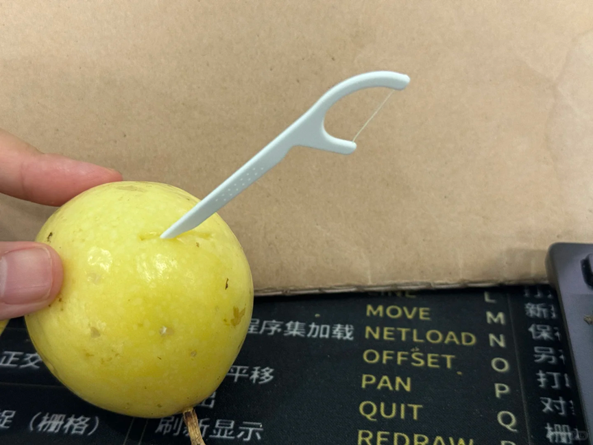 但平时吃水果,身边又没有水果刀的时候,就可以直接使用没有用过的牙线来去掉水果皮了,非常的方便。