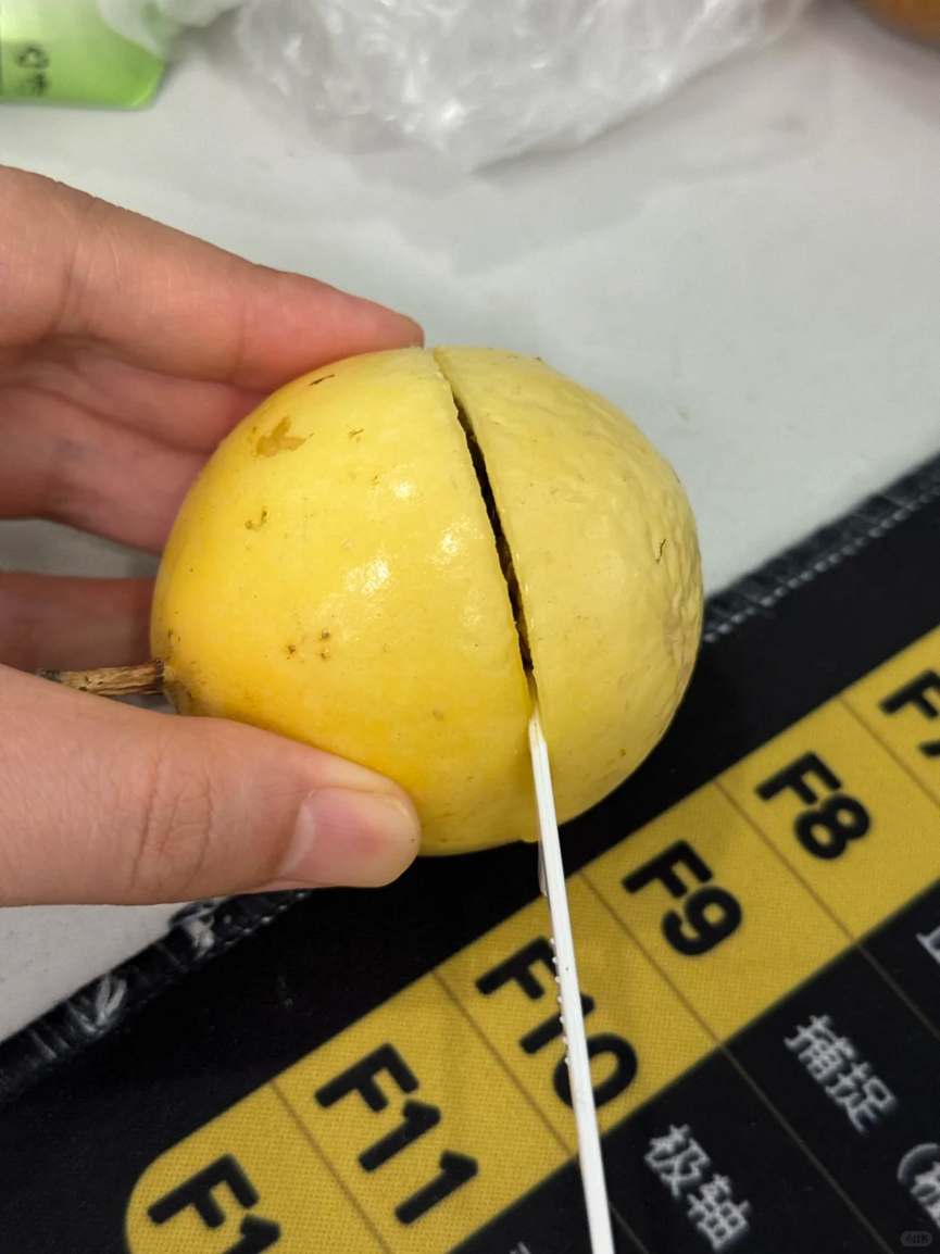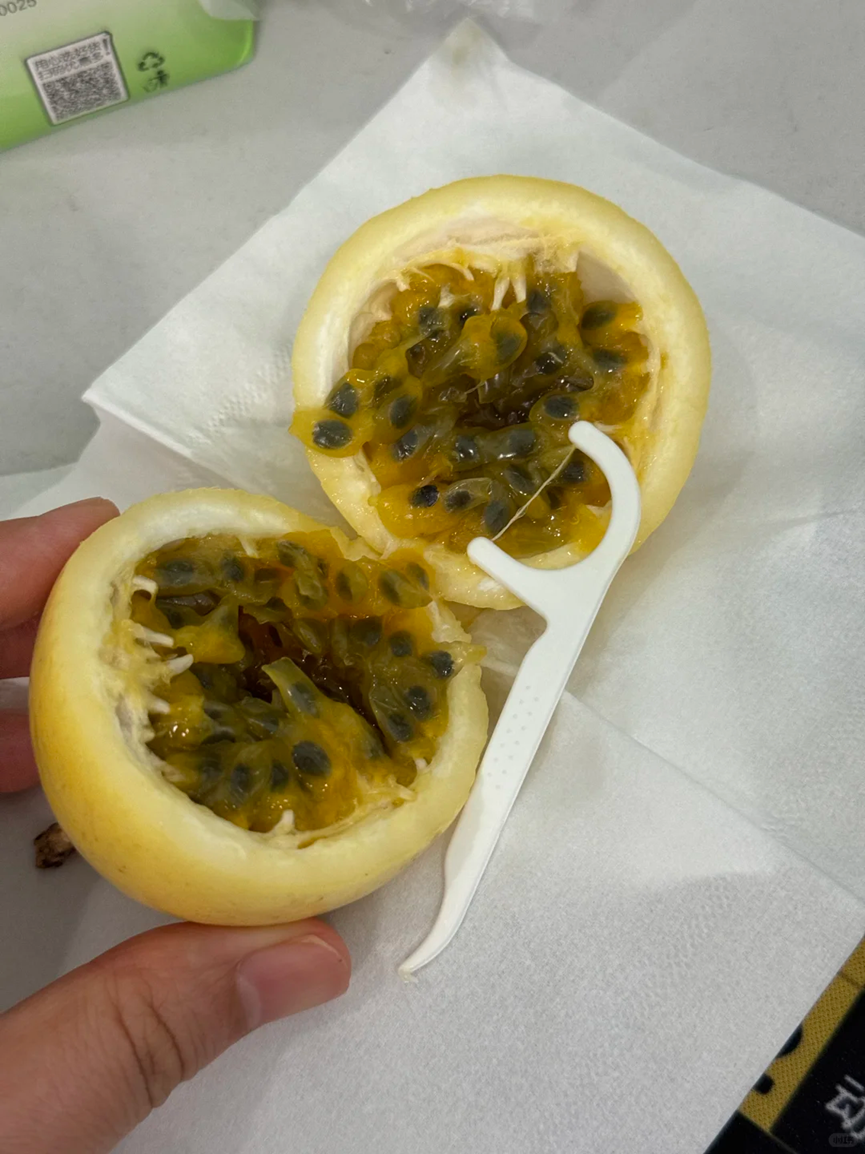 这个时候同事拿出了一根点外卖时赠送的牙线,告诉我可以直接用牙线来切百香果,我试了一下之后发现真的特别好用,而且也很简单。