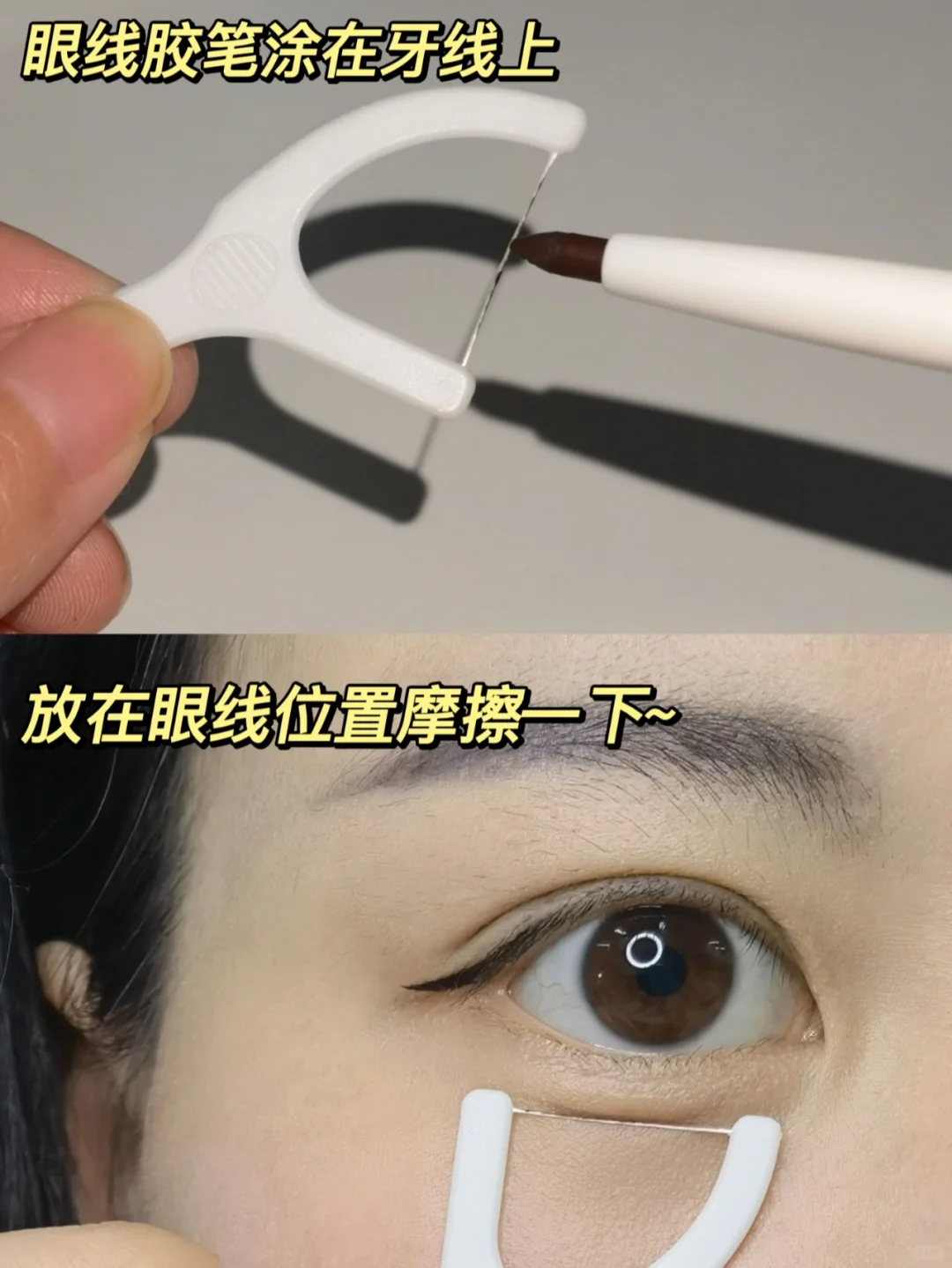 初学化妆或者是在化妆时想要偷懒的朋友,都可以尝试使用牙线来轻松搞定眼线以及卧蚕,非常的方便。