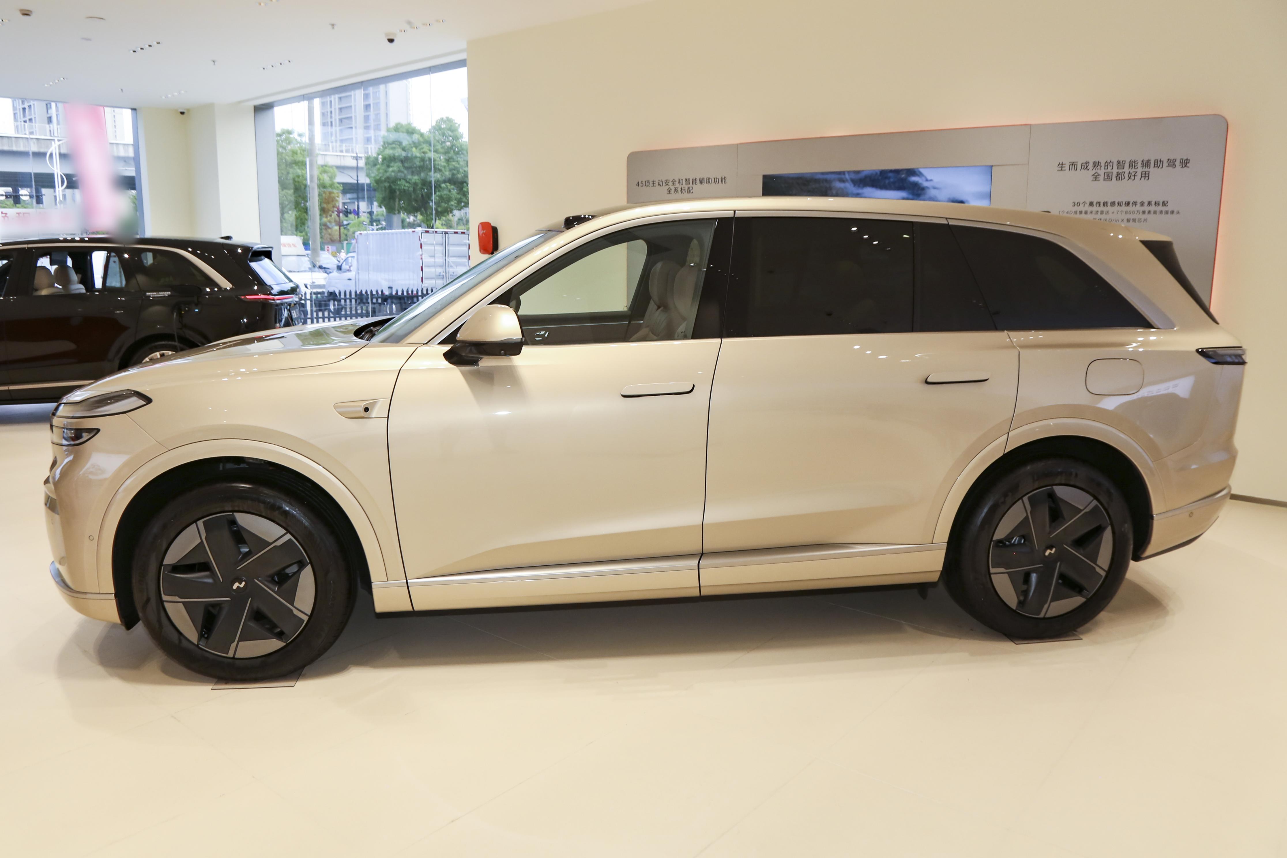 车身侧面线条简洁又硬朗,两段式腰线勾勒出了层次感,还巧妙地把第三排的厚重感给隐藏起来了。隐藏式门把手关门后和车身侧面巧妙的融合,不仅降低了风阻,还让侧面线条更流畅。搭配上银色车窗饰条和静音电吸门,满满的科技元素。车顶和翼子板上的摄像头提升了全景监控能力和科技氛围。