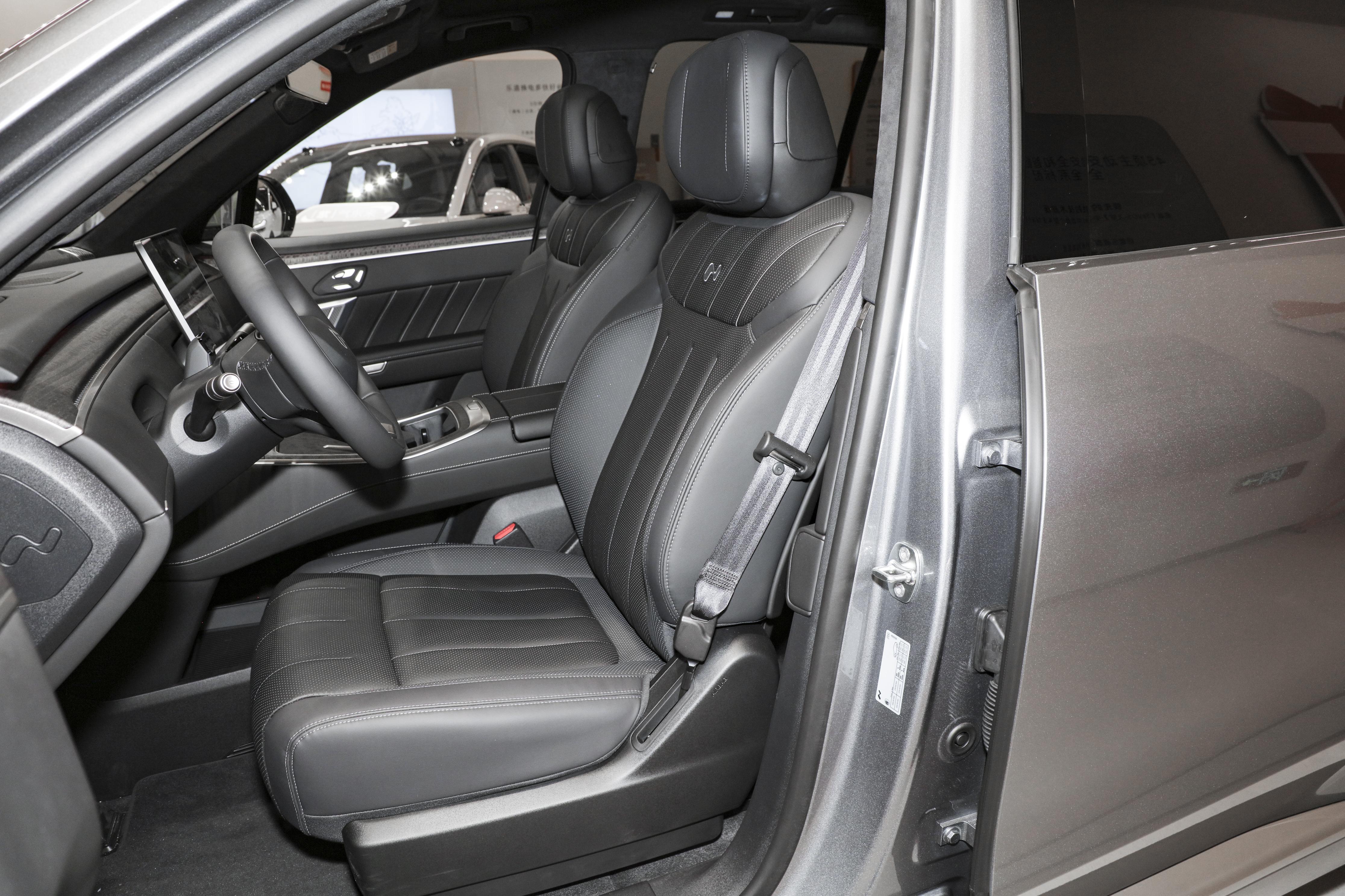 这款车的外观大气稳重,科技感十足,看着就很炫酷。前脸大面积封闭式进气格栅搭配上黑色的贯穿饰条,下方还保留了梯形进气口,一看就是纯电车型,而且这样的设计还优化了空气动力学。分体式头灯也很有亮点,上方灯带支持交互功能,能定义灯语,还有迎送宾场景交互;下方大灯有ADB自适应功能,像自适应远光、动态弯道照明这些都有,提升了夜晚行车的安全性。引擎盖上方的筋线从车头一直延伸到A柱,让前脸看起来更有力量感。