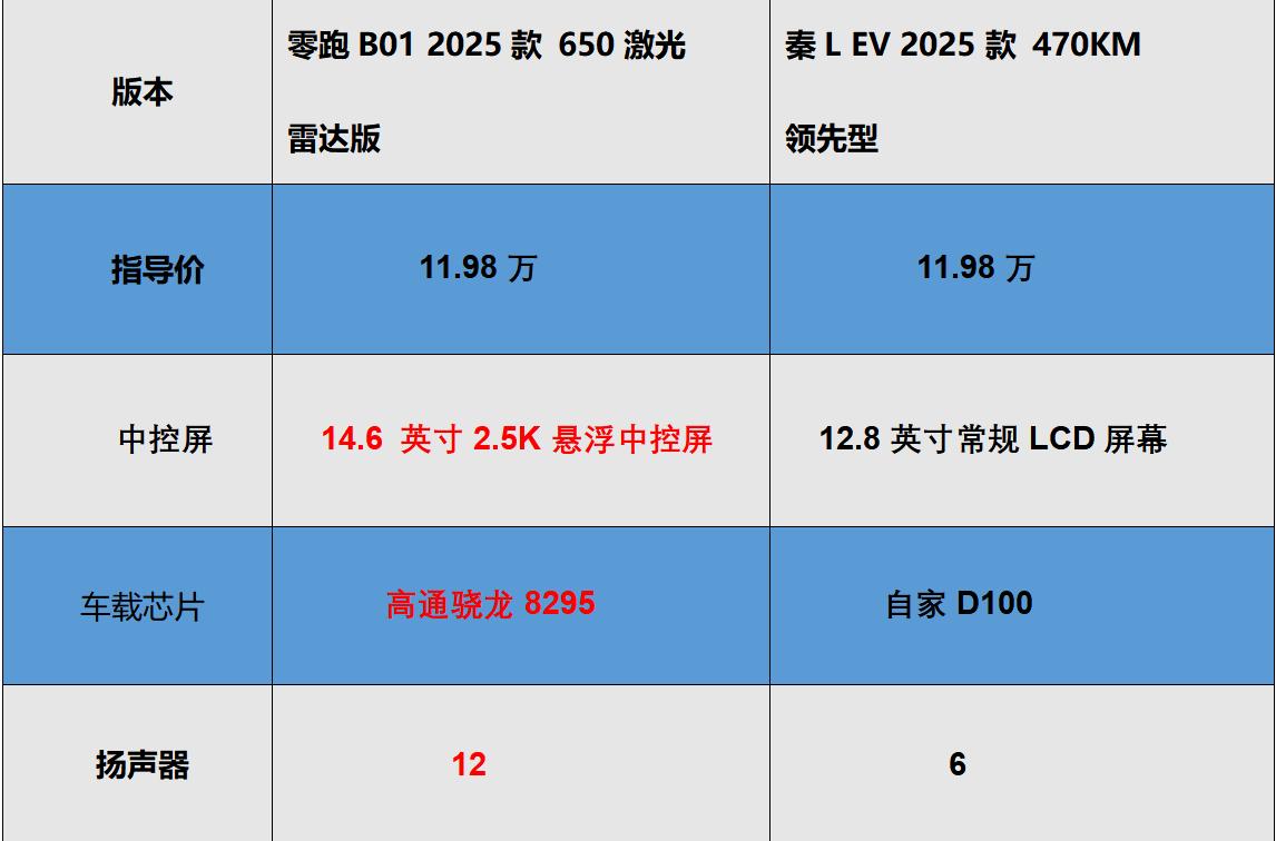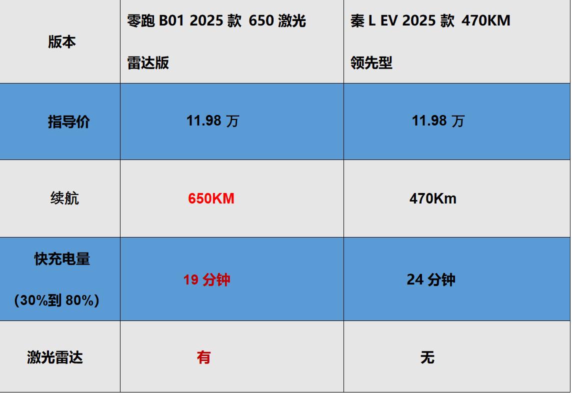 如果说自己的购车预算在12万左右,零跑 B01 650 激光雷达版以 "长续航 + 激光雷达 + 高算力智能座舱" 的组合实现了更高级的体验,非常适合长续航与科技感的用户,而秦 L EV 470KM 领先型则胜在品牌口碑与基础实用,适合对配置需求简单的保守型消费者,如果让我推荐,我还是明显更加倾向于零跑B01,毕竟产品力确实强很多,而且值得注意的是,进入10月份后,零跑优惠政策还是很大的,就拿零跑B01来说之前预算买中配价格的消费者都可以冲顶配了,简直太香了!