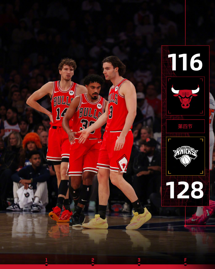 在开局豪取5连胜之后,公牛今天在客场以116-128不敌尼克斯,遭遇了赛季首败,5连胜也被终结。不过好在76人之前就已经遭遇赛季首败,目前和公牛一样战绩都是为5胜1负,76人暂居东部第一,公牛高居东部第二。尼克斯之前遭遇了3连败,所以今天这场胜利对他们来说也很重要,不过他们目前的战绩仍然只有3胜3负。