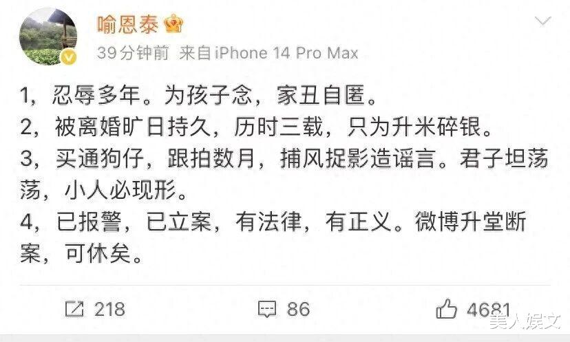 2025 年 11 月 19 日深夜,喻恩泰在社交媒体上发布的四点声明,犹如一颗重磅炸弹,瞬间在网络上掀起了惊涛骇浪。这份声明,不仅是他对这场持续三年的离婚风波的首次正面回应,更是他试图打破外界误解、还原事实真相的有力尝试。
