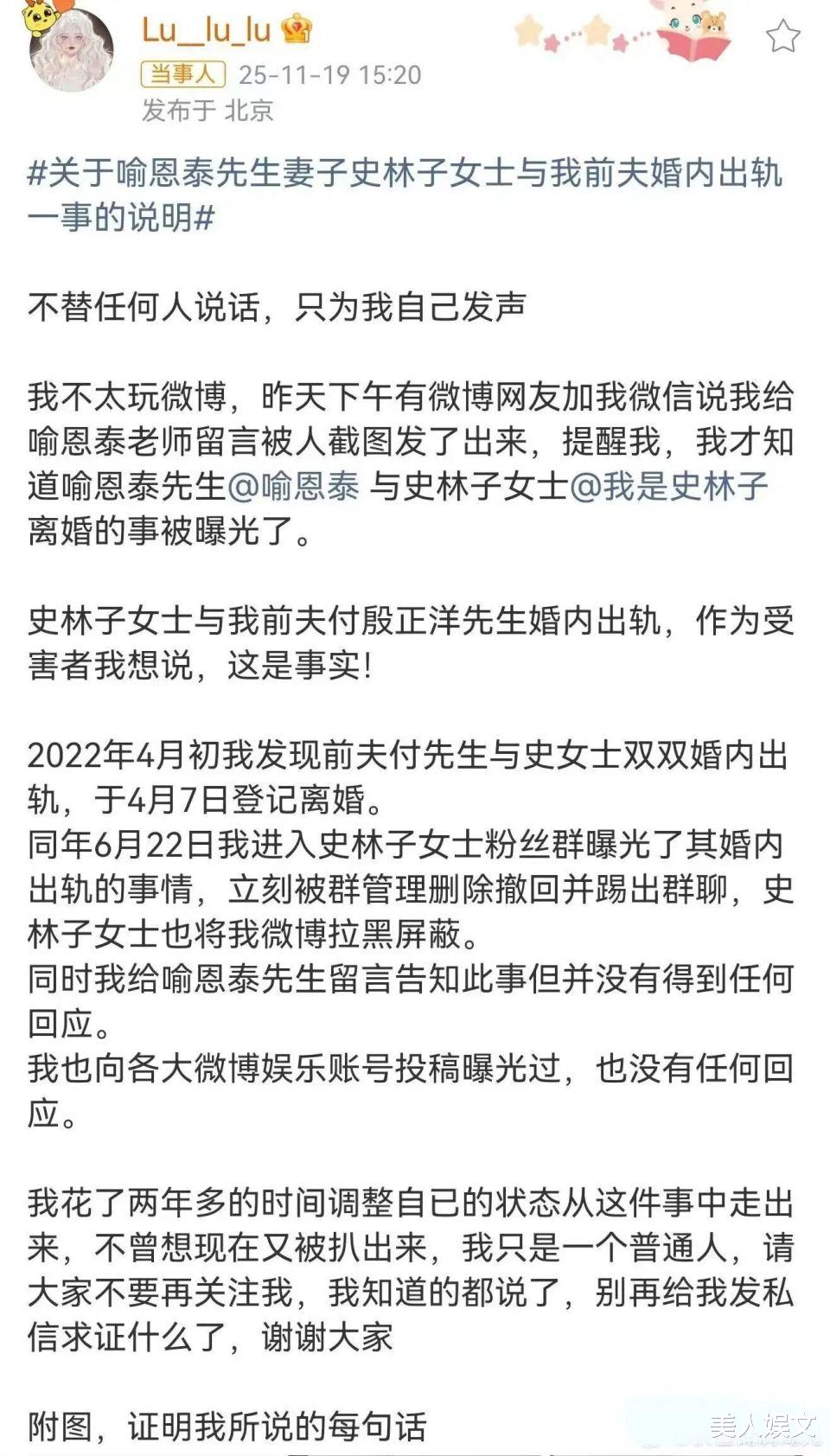 就在喻恩泰发布声明后不久,事件迎来了一个意想不到的关键反转。2022 年离婚的徐女士(游泳教练付某前妻)站了出来,实名爆料史林子在 2020 年与自己的丈夫发展婚外情。这一爆料犹如一颗重磅炸弹,瞬间在网络上引发了轩然大波,让原本就扑朔迷离的离婚风波变得更加复杂。