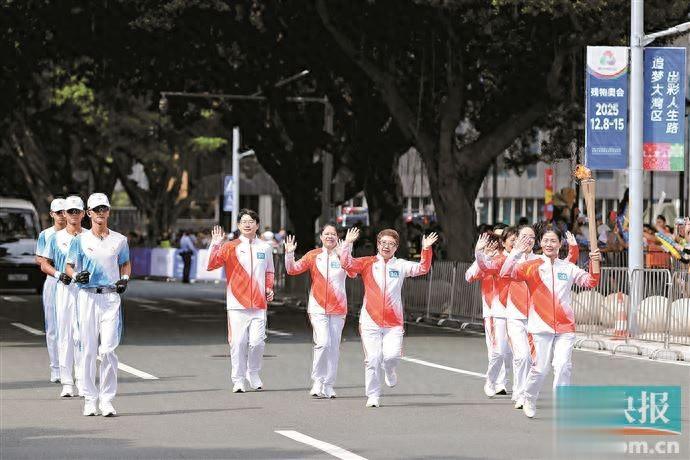 本次火炬传递最大特色是“三地联动、四城同传”。200棒火炬手,每个城市跑动50棒。这些火炬手涵盖先进模范人物代表、基层一线代表、体育工作者代表,每一位火炬手都以卓越成就点亮各自领域。值得一提的是,环卫工人、外卖骑手、公交驾驶员、护士、志愿者等群体共同参与火炬传递,让普通人走上全运大舞台,生动诠释“全民全运”的理念,彰显了粤港澳大湾区的开放、包容、温暖与奋进的底色。