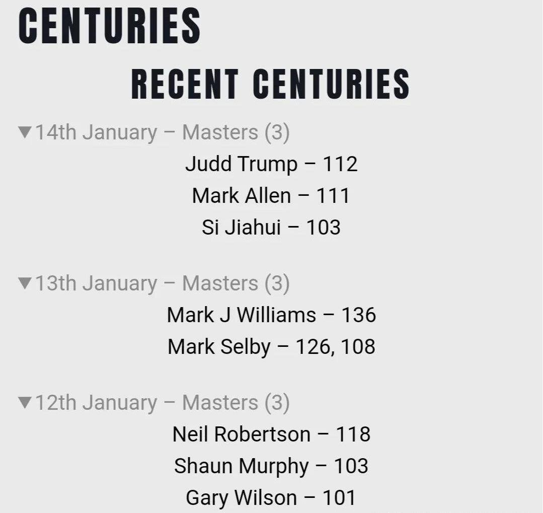 这个比赛日保持了前两天的传统,也打出三杆单杆破百,已经出局的马威打出的单杆136,依然占据了单杆最高分,继续着15000镑奖金的梦。晋级的六位球员中,唯独在大师赛历史正赛产生的五杆147中,打出两杆的丁俊晖没有打出破百。