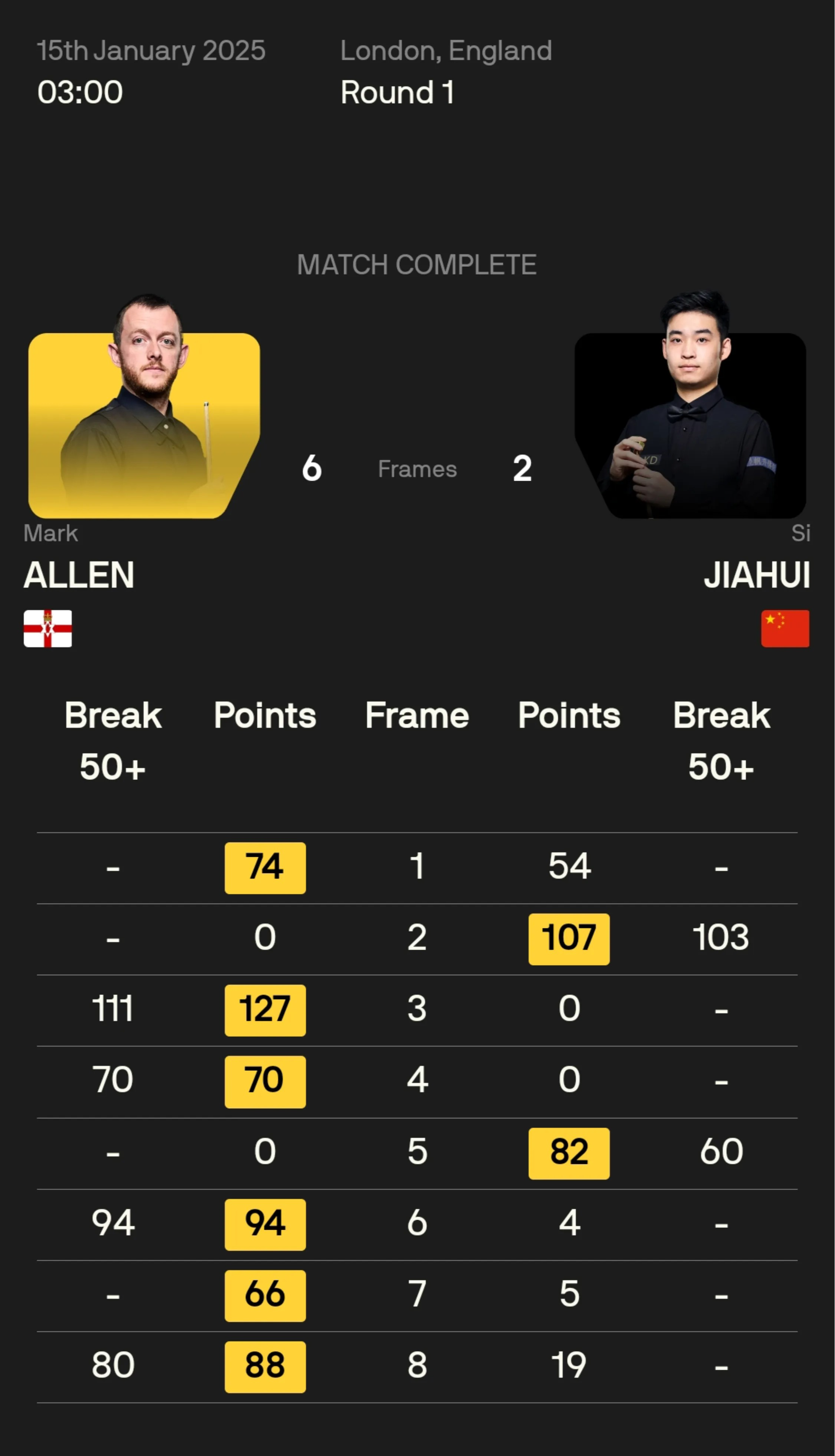 局休回来斯佳辉打出单杆60分,追回一局,接下来马克·艾伦打出94、80分两杆单杆致胜,一波三连击,连赢三局,锁定胜利;马克·艾伦以6-2战胜斯佳辉,晋级八强。