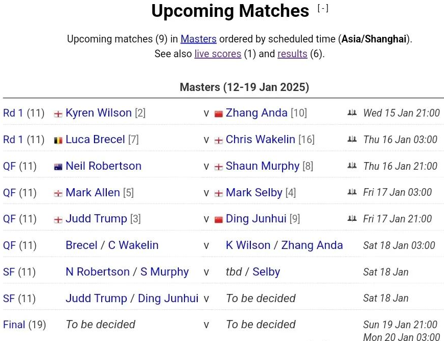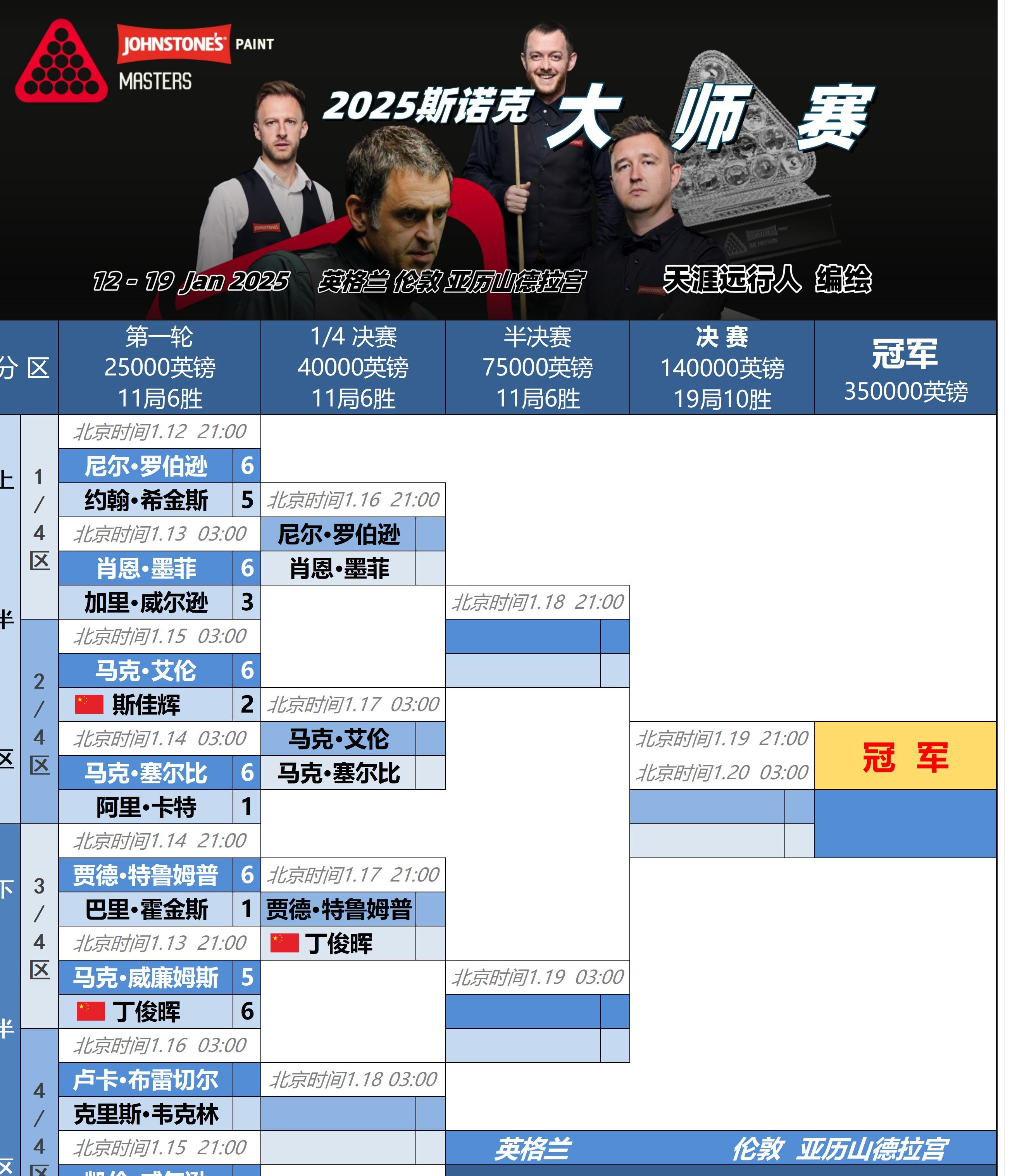北京时间1月15日凌晨6时24分,2025斯诺克大师赛首轮第三比赛日的两场比赛,在伦敦亚历山德拉宫全部决出了胜负。
