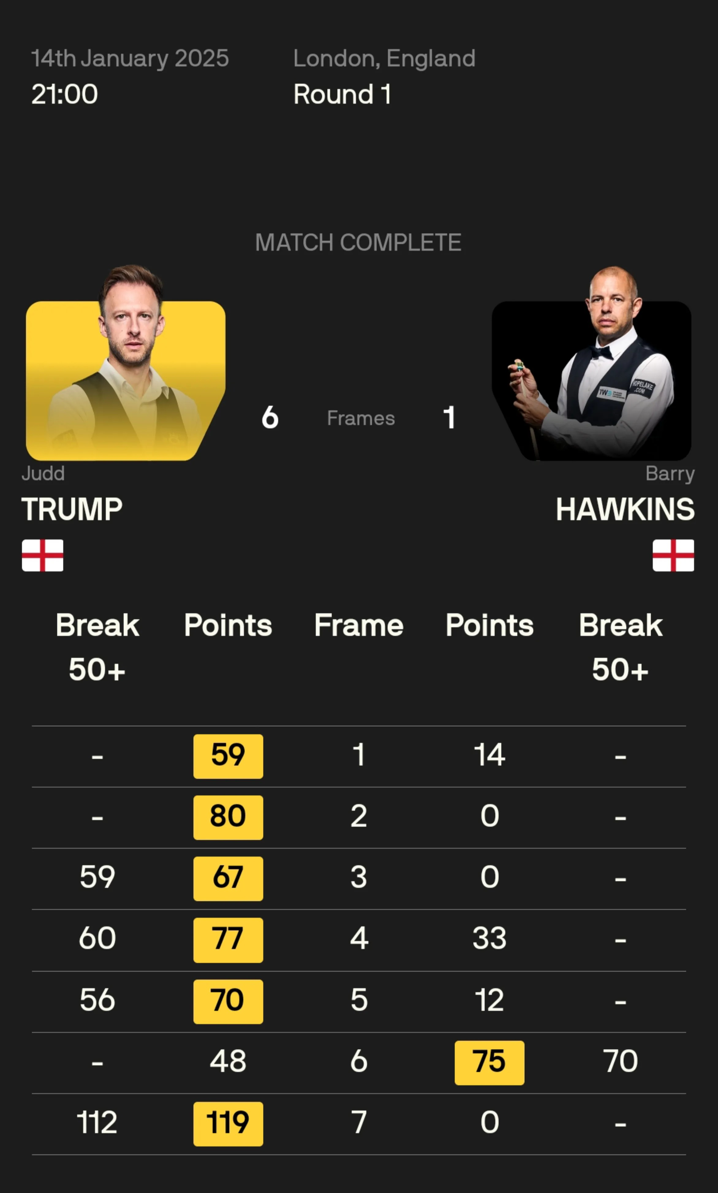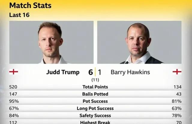 第七局贾德·特鲁姆普觅得上手机会,打出单杆112分,锁定最终的胜利,贾德·特鲁姆普以6-1淘汰巴里·霍金斯,强势挺进八强。