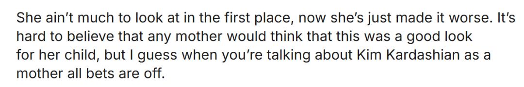 “本来就没啥亮眼之处,现在这么打扮更是雪上加霜...很难想象会有母亲觉得这身打扮适合自己孩子。不过既然说的是金·卡戴珊当妈的事,那什么都有可能发生。”