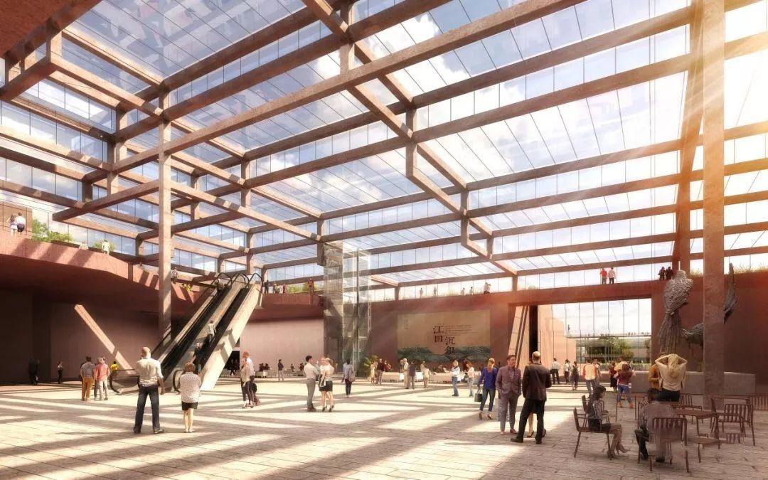 建筑依据地块规划轴线设计入口主轴线,将入口及主要空间打造成具有考古岩层质感的洞穴体验空间,让游客刚进入就仿佛踏入考古现场。