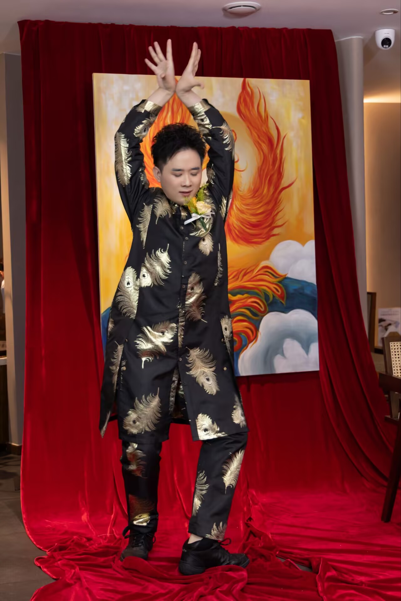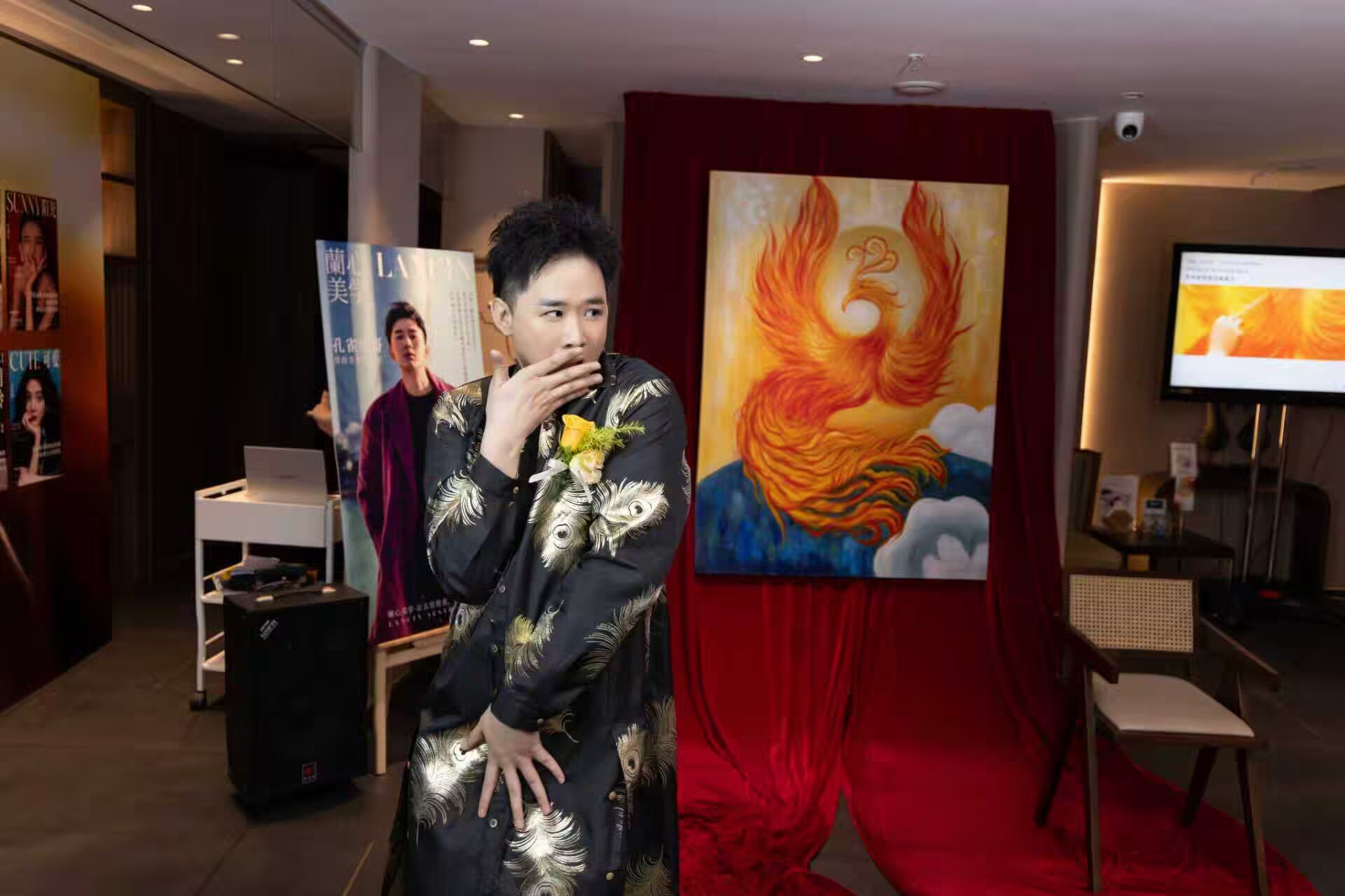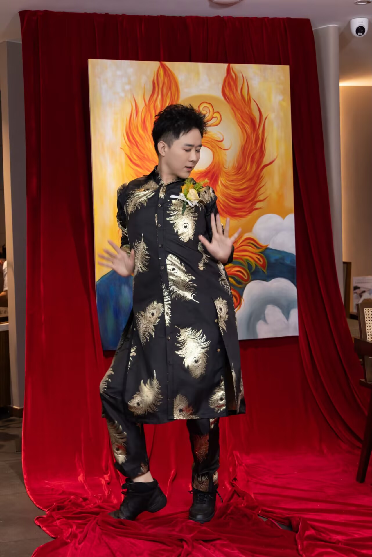 除了主持工作,孔雀哥哥还全程 “开挂”,为活动增添多重惊喜。他身着亮眼造型,现场献上一段火辣热舞,流畅的肢体动作、极具张力的舞台表现,瞬间点燃全场热情,将活动气氛推向顶点,台下观众纷纷起身欢呼,掌声与尖叫声此起彼伏。